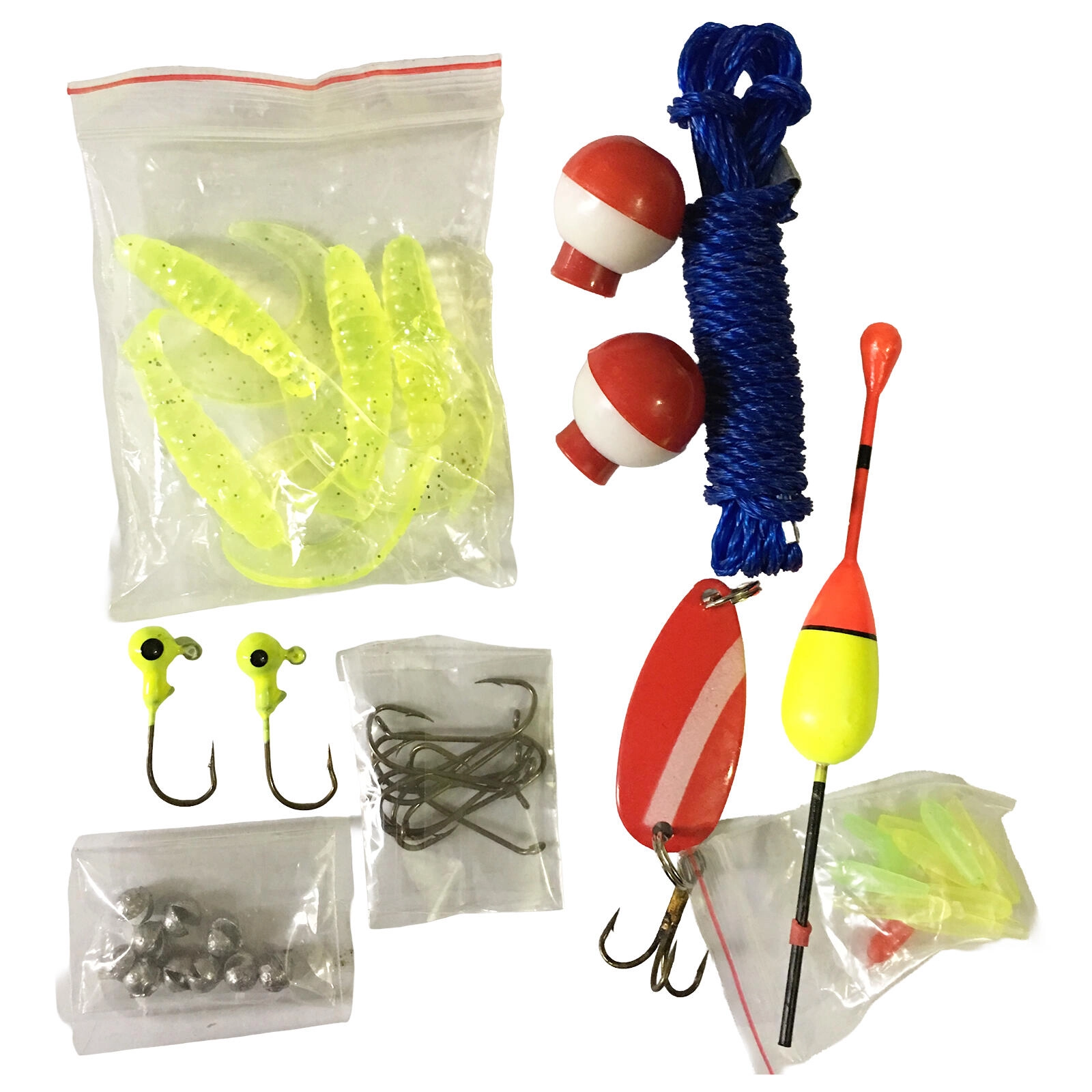 Különféle csalik, horgok és úszók széles helyzetkört fednek le a vízparton – csak bontsa ki és horgásszon.