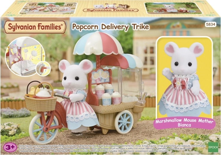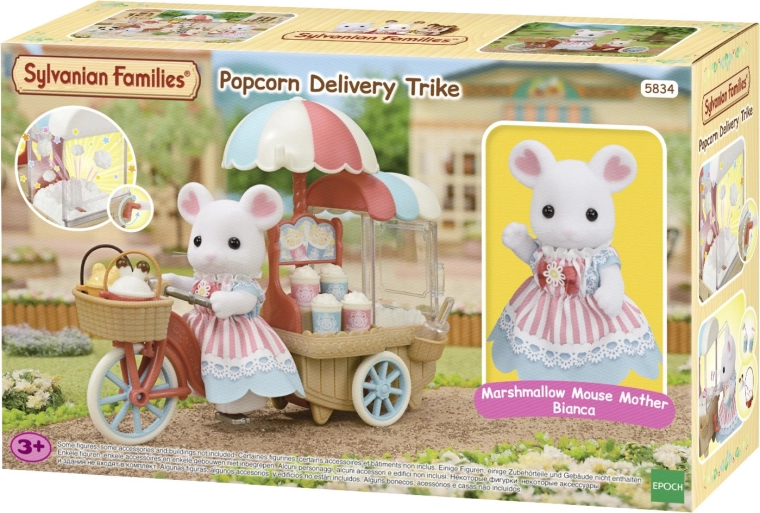 Kompakt stand triciklivel, kosárral és felszolgáló felülettel a popcornhoz. Szuper választás boltos játékhoz és a SYLVANIAN városka bővítéséhez.