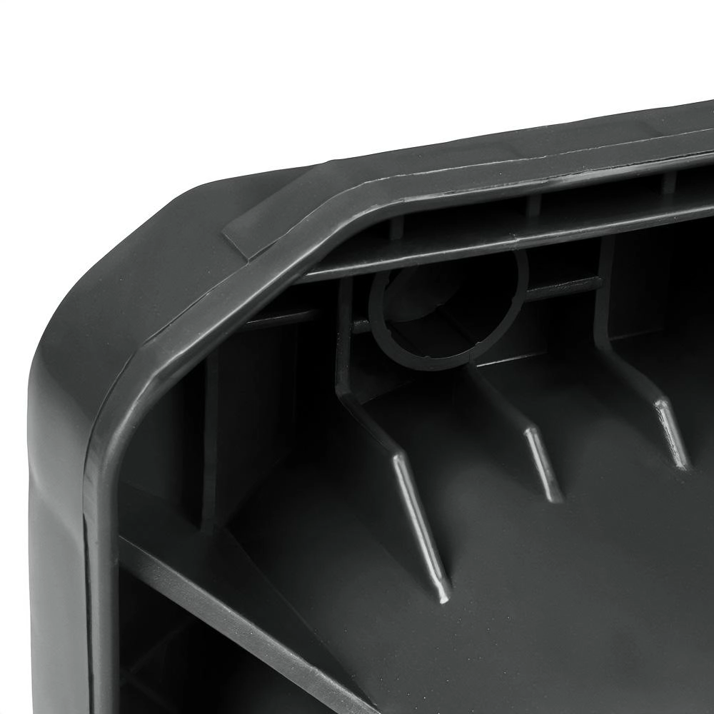 A masszív bordázat és a megerősített sarkok növelik a teherbírást, valamint az ütés- és a hosszan tartó kültéri használattal szembeni ellenállást.
