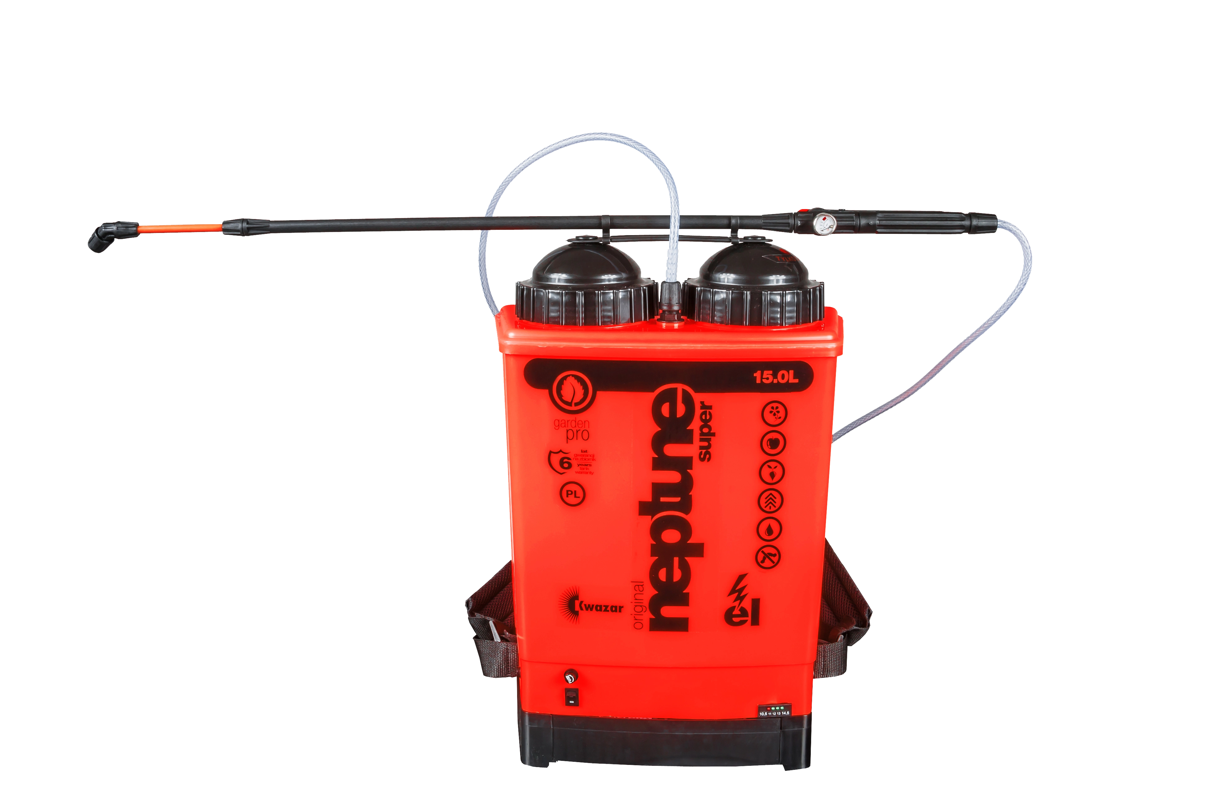 A NEPTUN GARDEN 15 l egy professzionális háti permetező, melyet 12 V-os gél akkumulátor hajt, így a permetezés egyenletesen és pontosan, erőkifejtés nélkül végezhető. A tartályon belüli önálló nyomástartó egység stabil nyomást biztosít, míg a háromlépcsős szűrés megóvja a szivattyút és a fúvókákat a szennyeződésektől. A tartályon található szintjelző lehetővé teszi a permetlé szintjének és térfogatának pontos mérését.