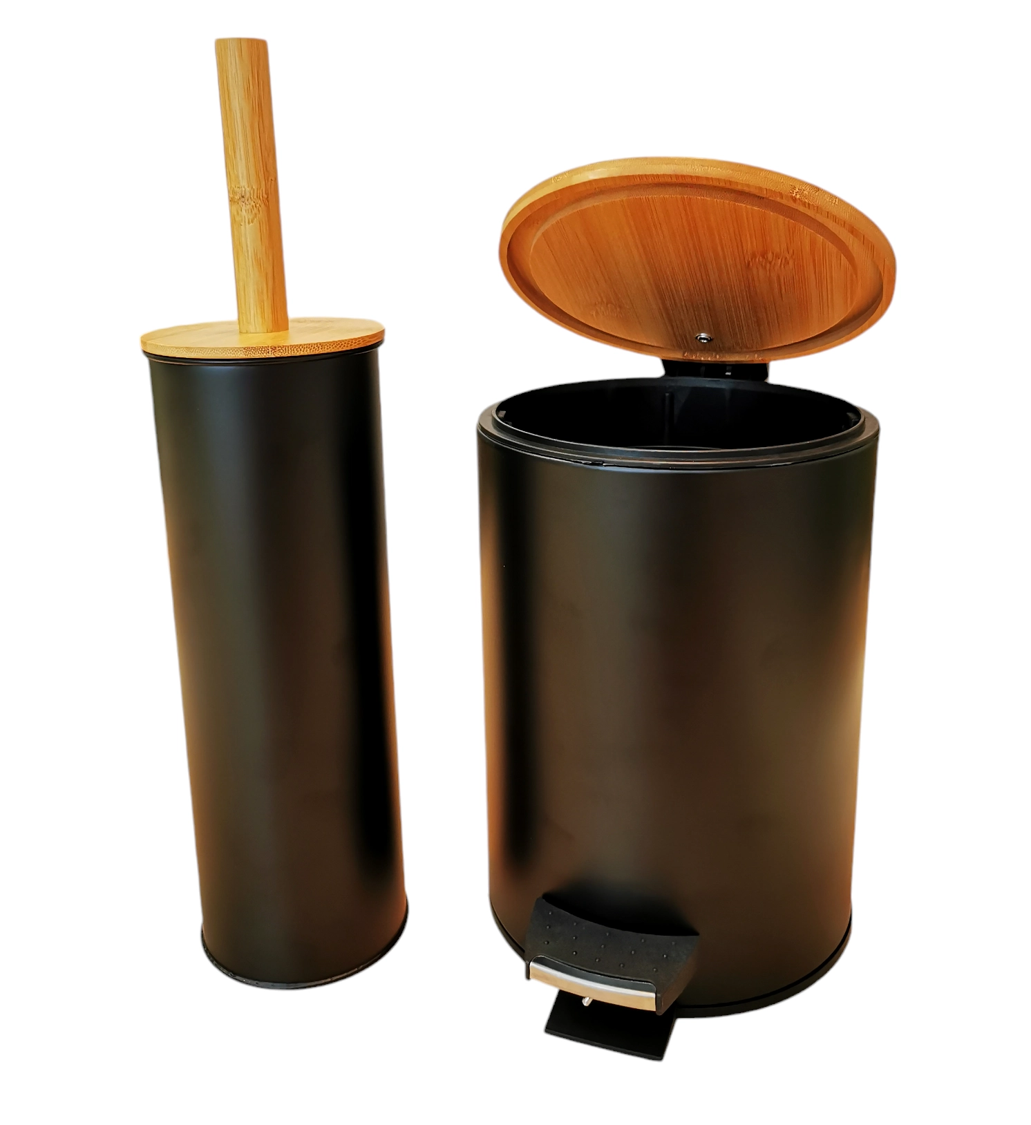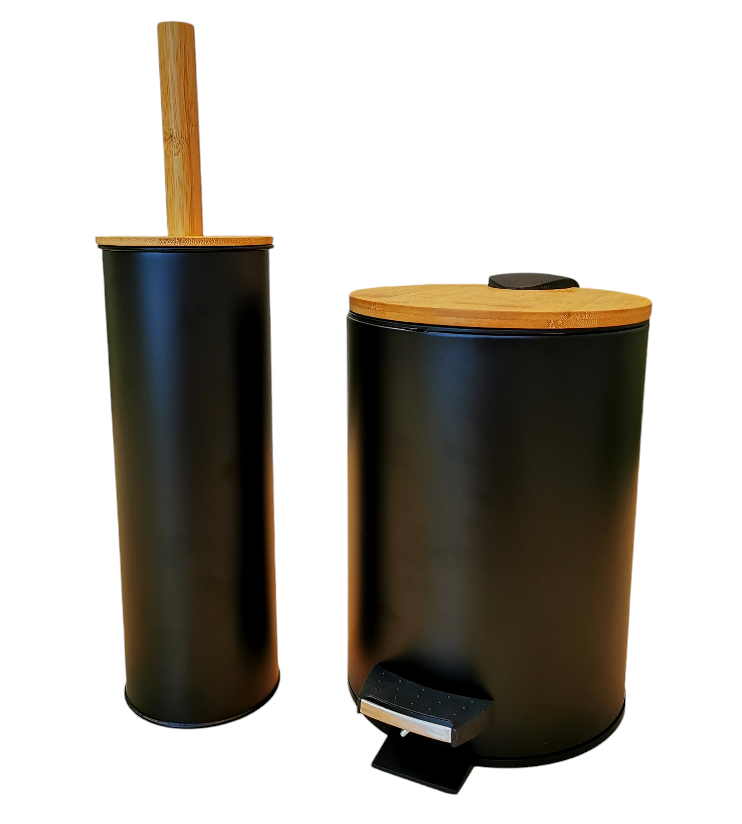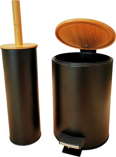 Stílusos, fekete matt fürdőszobai szett természetes bambusz akcentusokkal: 3 l-es szemetes Soft Close záródású fedéllel és WC-kefe összeillő tartóban. A praktikus kivehető belső vödör megkönnyíti a tisztítást, a pedálos működtetés higiénikus, kézérintés nélküli nyitást biztosít, a matt fekete és bambusz modern kombinációja pedig elegáns megjelenést kölcsönöz a fürdőszobának.
