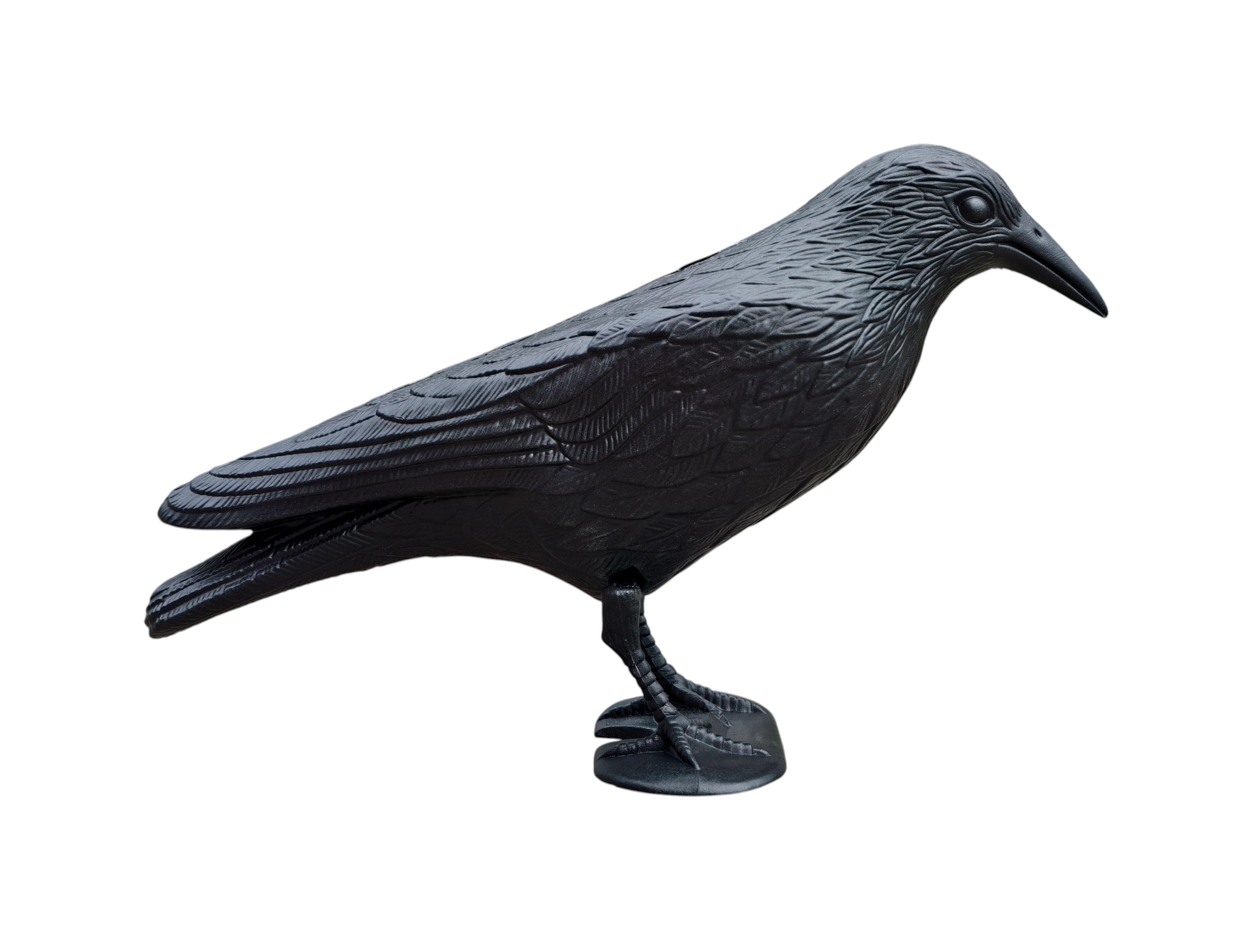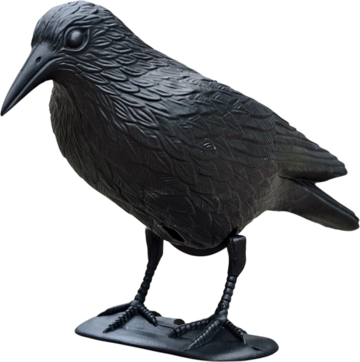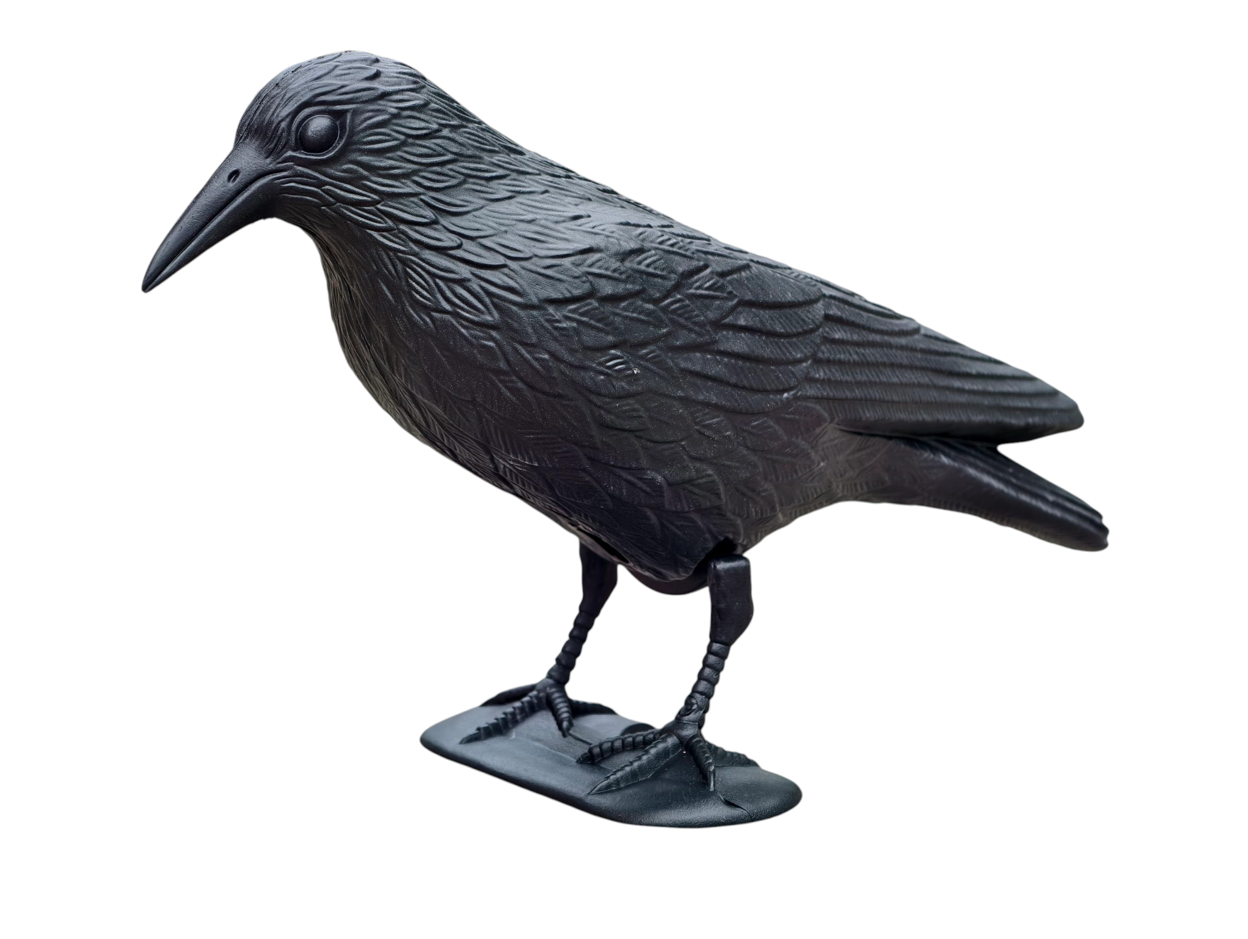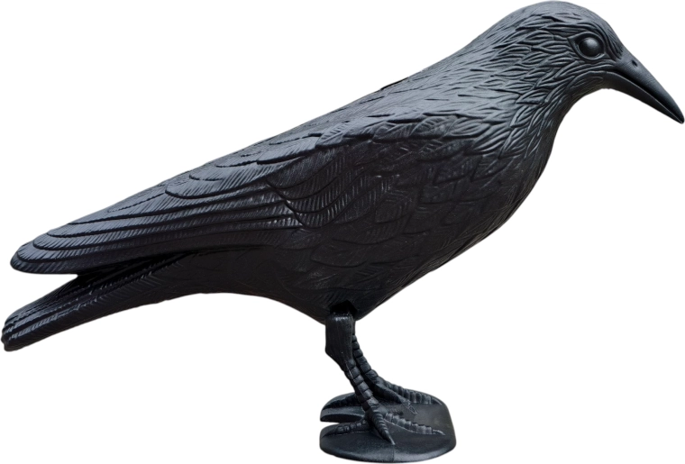 A részletgazdag tolltextúra és a természetes arányok az igazi hollót idézik, ami fokozza az elrettentő hatást a nemkívánatos madarakra.