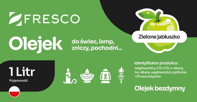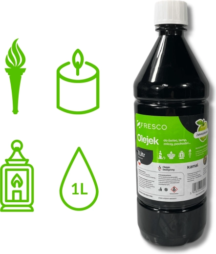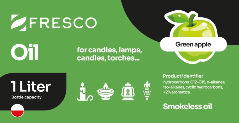 A lámpákhoz, fáklyákhoz és olajos gyertyákhoz készült, kellemes almás aromájú olaj stabil, világos és finom lángot ad nem kívánt füst nélkül (megfelelő kanócbeállítás mellett). Kiválóan alkalmas kerti világításhoz és a beltér meghitté tételéhez, ideális dekoratív lámpákhoz és klasszikus olajos gyertyákhoz.