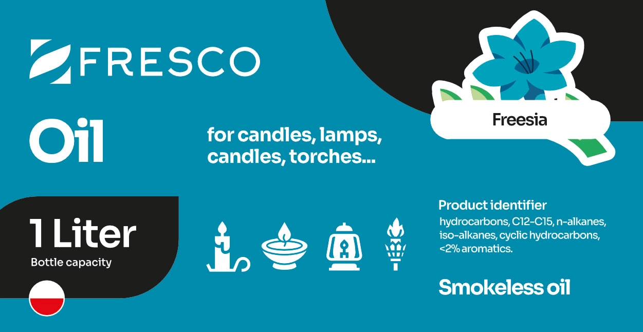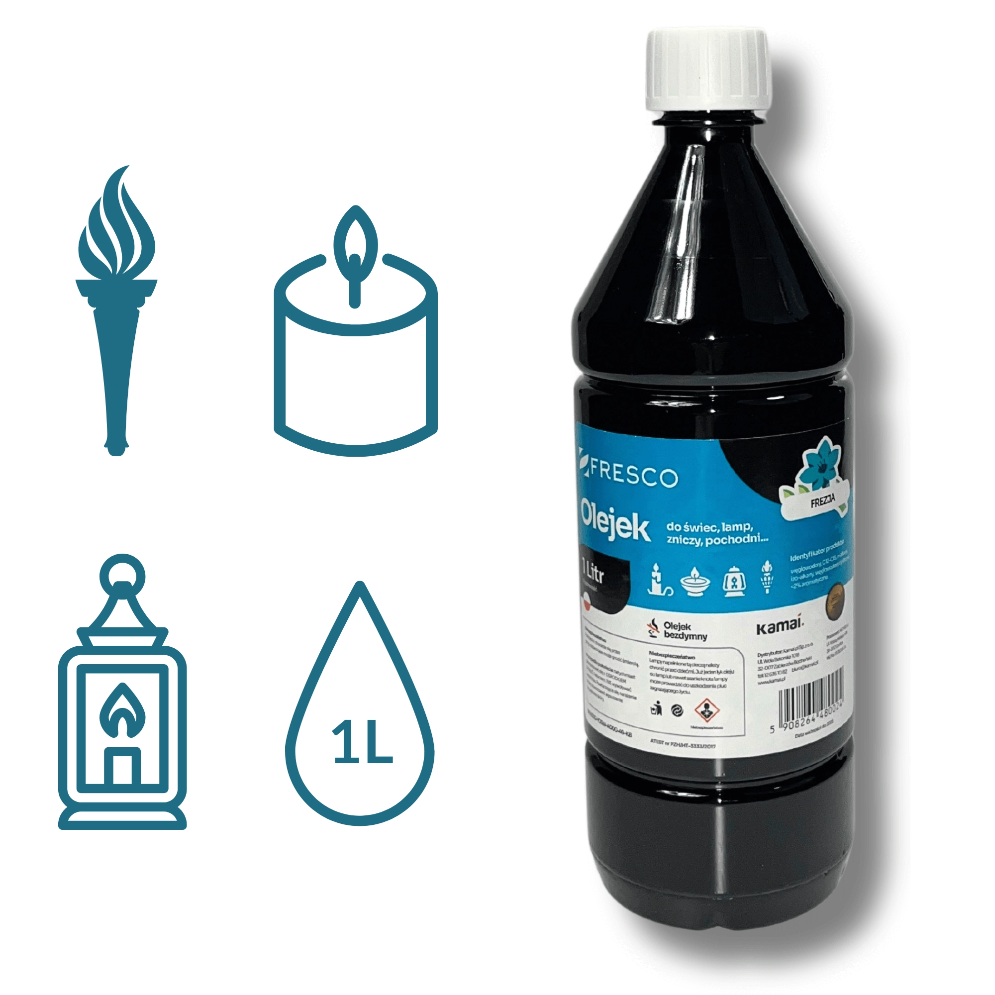 Kiváló minőségű olajüzemanyag lámpákhoz, fáklyákhoz és gyertyákhoz, finom frézia illattal. Fényes és stabil lánggal ég, és a kanóc megfelelő beállítása mellett füstmentesen. Alkalmas beltéri és kültéri használatra, gyermekbiztonsági kupakkal a véletlen kinyitás és kiömlés ellen.