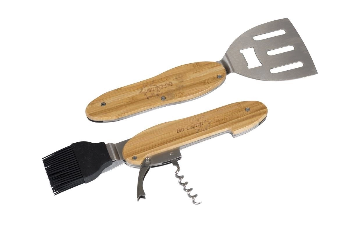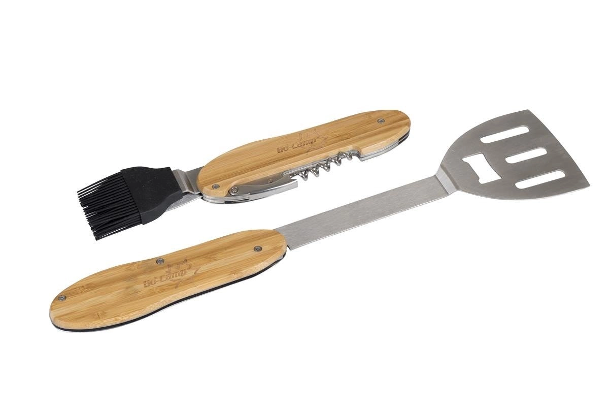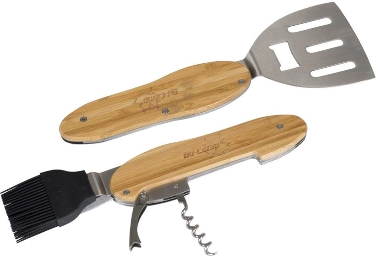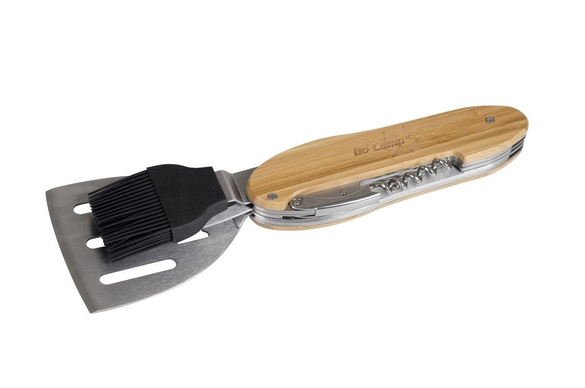 Praktikus és tartós 5 az 1-ben grill szerszám, amely egyesíti a lapátot, a villát, a szilikon kenőecsetet, a dugóhúzót és az üvegnyitót egy kompakt készletben. Az ergonomikus bambusz markolat és a rozsdamentes acél kényelmes és hosszan tartó használatot biztosít minden grillezésnél.