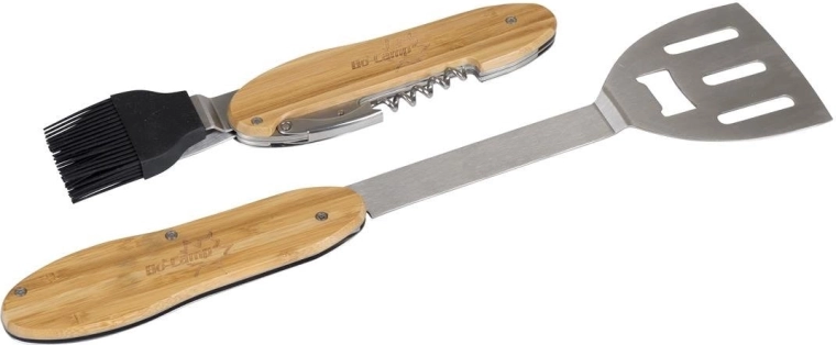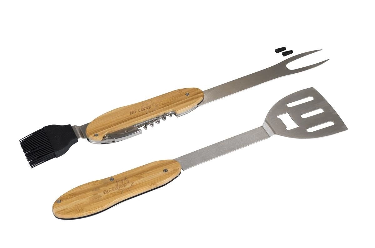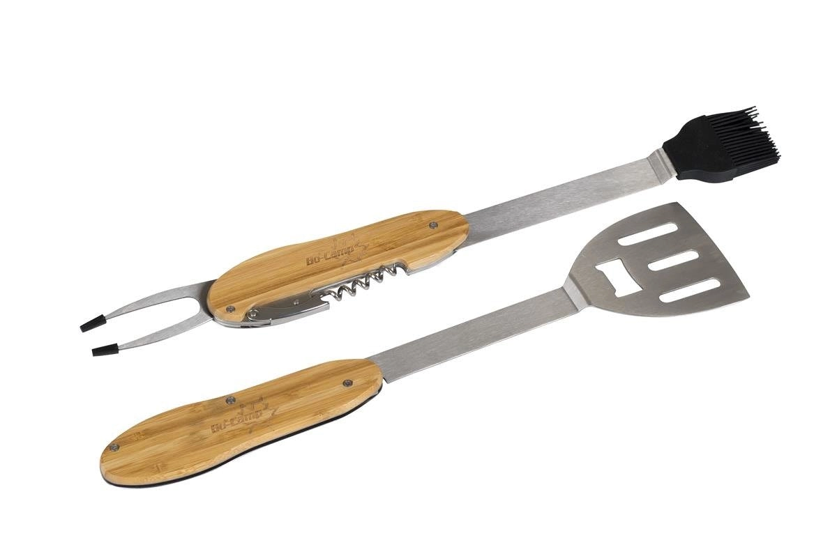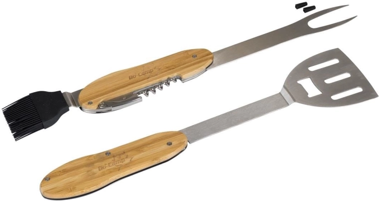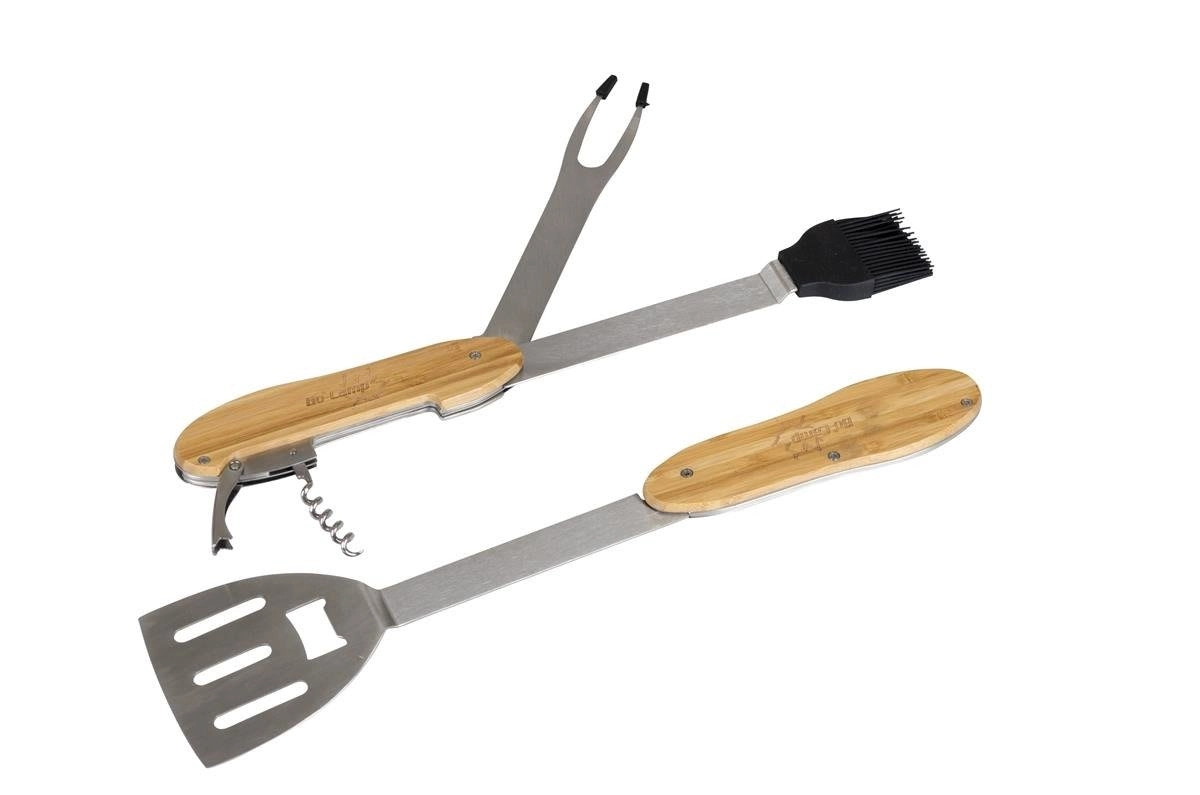 Praktikus és tartós 5 az 1-ben grill szerszám, amely egyesíti a lapátot, a villát, a szilikon kenőecsetet, a dugóhúzót és az üvegnyitót egy kompakt készletben. Az ergonomikus bambusz markolat és a rozsdamentes acél kényelmes és hosszan tartó használatot biztosít minden grillezésnél.