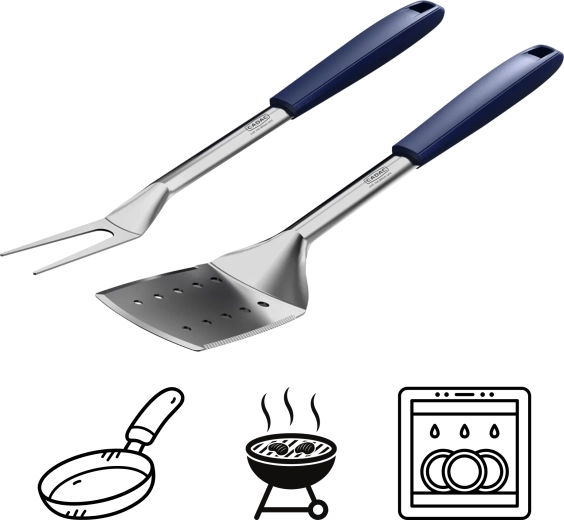 A szélesebb fejű lapát ideális steakek, halak vagy burgerek forgatásához, a villa pedig megkönnyíti a hús felszúrását és átvitelét. Tartós kialakításának és átgondolt ergonómiájának köszönhetően ez a szett kiváló választás kerti grillezéshez és mindennapi főzéshez is.