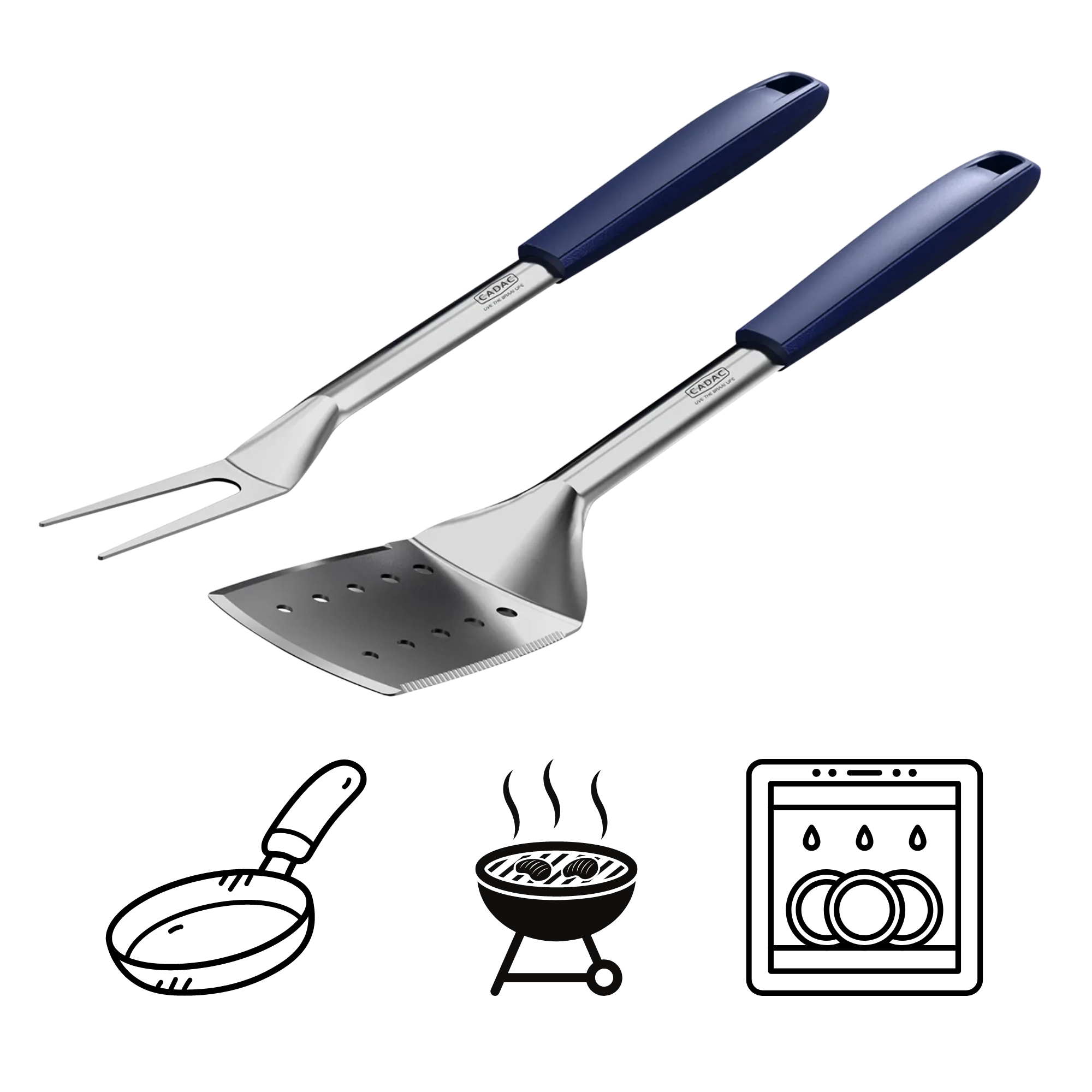 A CADAC szett a munkarészeknél rozsdamentes acélt, a nyeleknél hőálló műanyagot kombinál. A hosszú eszközök (45 cm) biztos fogást és kellő távolságot nyújtanak a hőtől, míg a mágneses végek lehetővé teszik a gyors elhelyezést fém felületen (a rozsdamentes acélt kivéve). Az integrált támaszok a hegyeket és a lapátot a munkalap fölött tartják, megakadályozva az érintkezést a szennyeződésekkel.