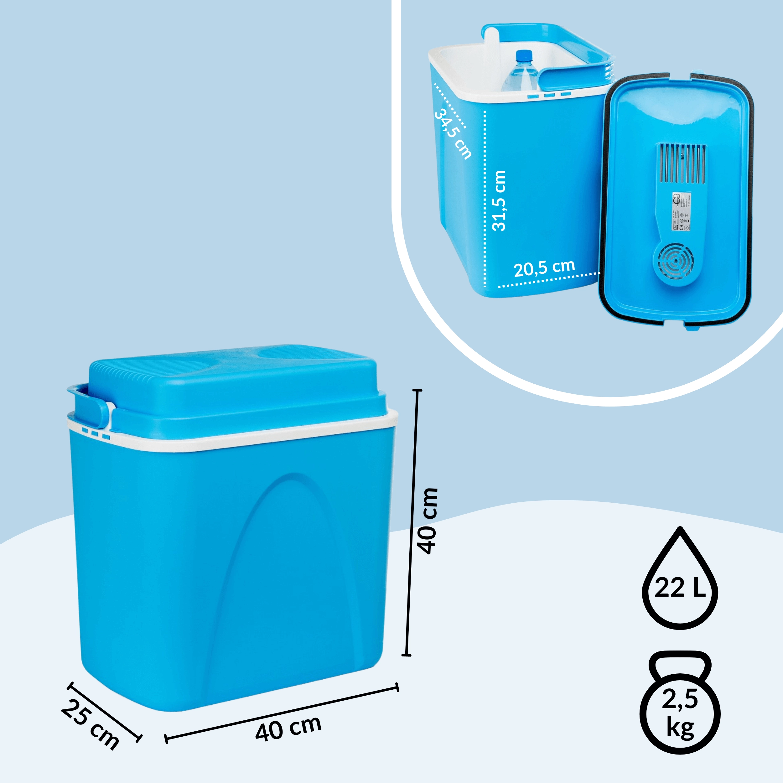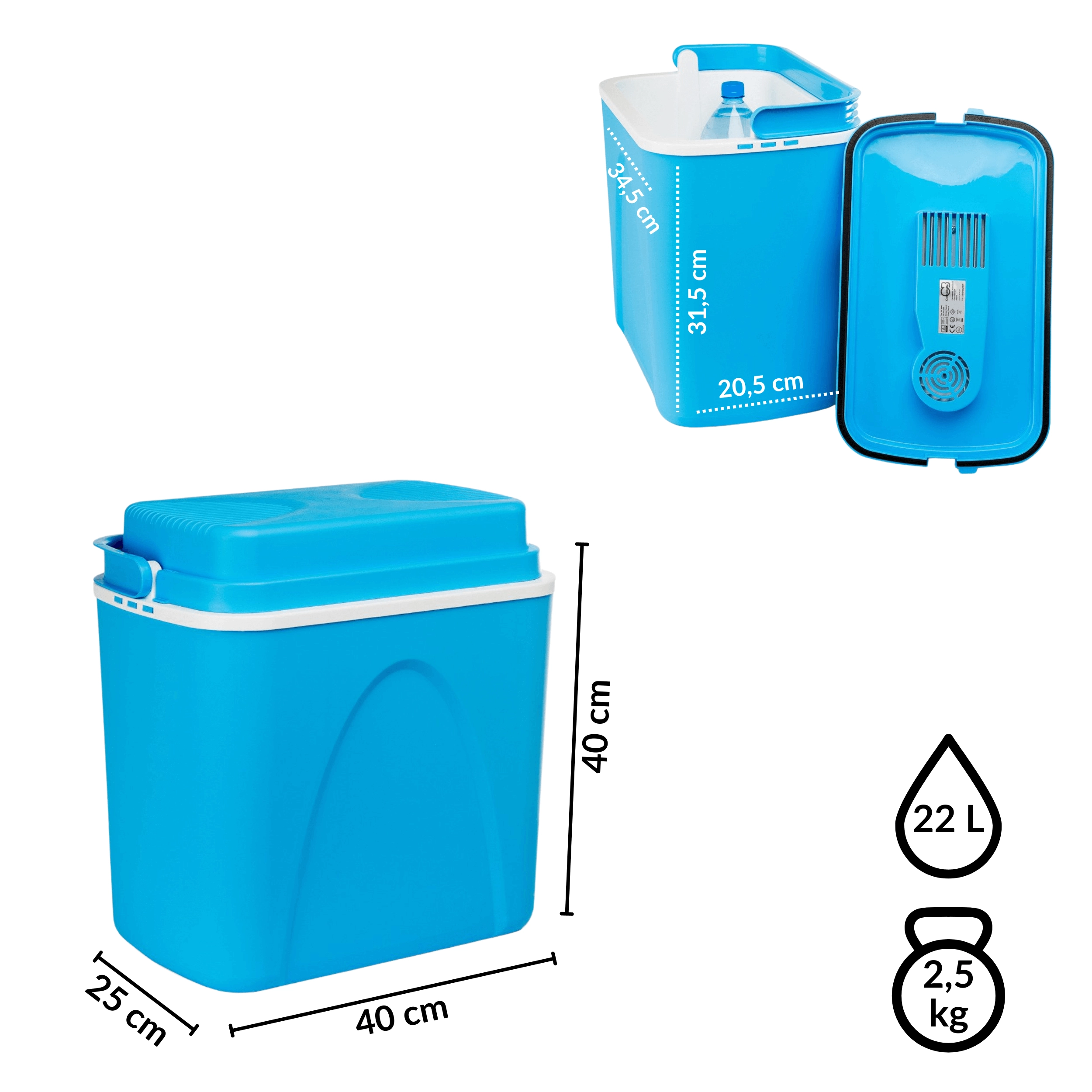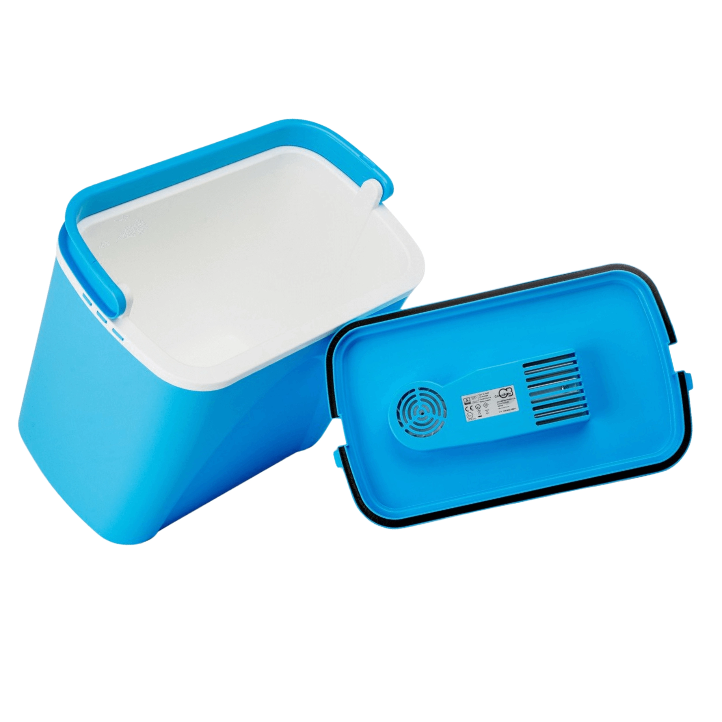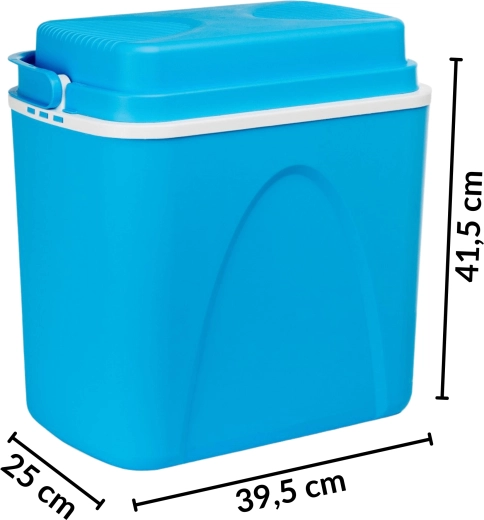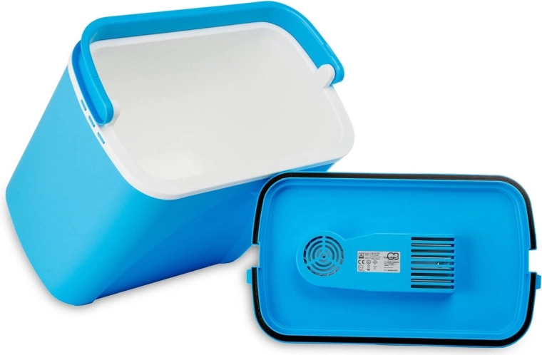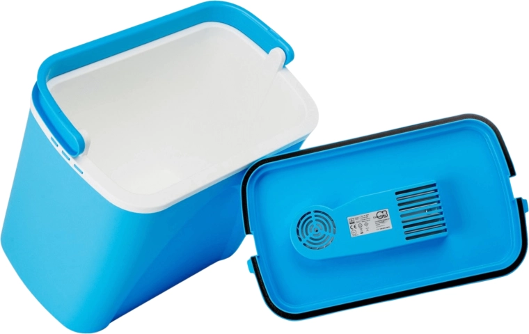 Az átgondolt méreteknek köszönhetően a 1,5 l-es palackok függőleges helyzetben állíthatók el, az uzsonnák és italok áttekinthetően rendszerezhetők. A könnyű, mégis masszív polipropilén külső ellenálló és könnyen tisztítható. A stílusos kék dizájn remekül mutat a strandon, a kempingben és az autó csomagtartójában is.