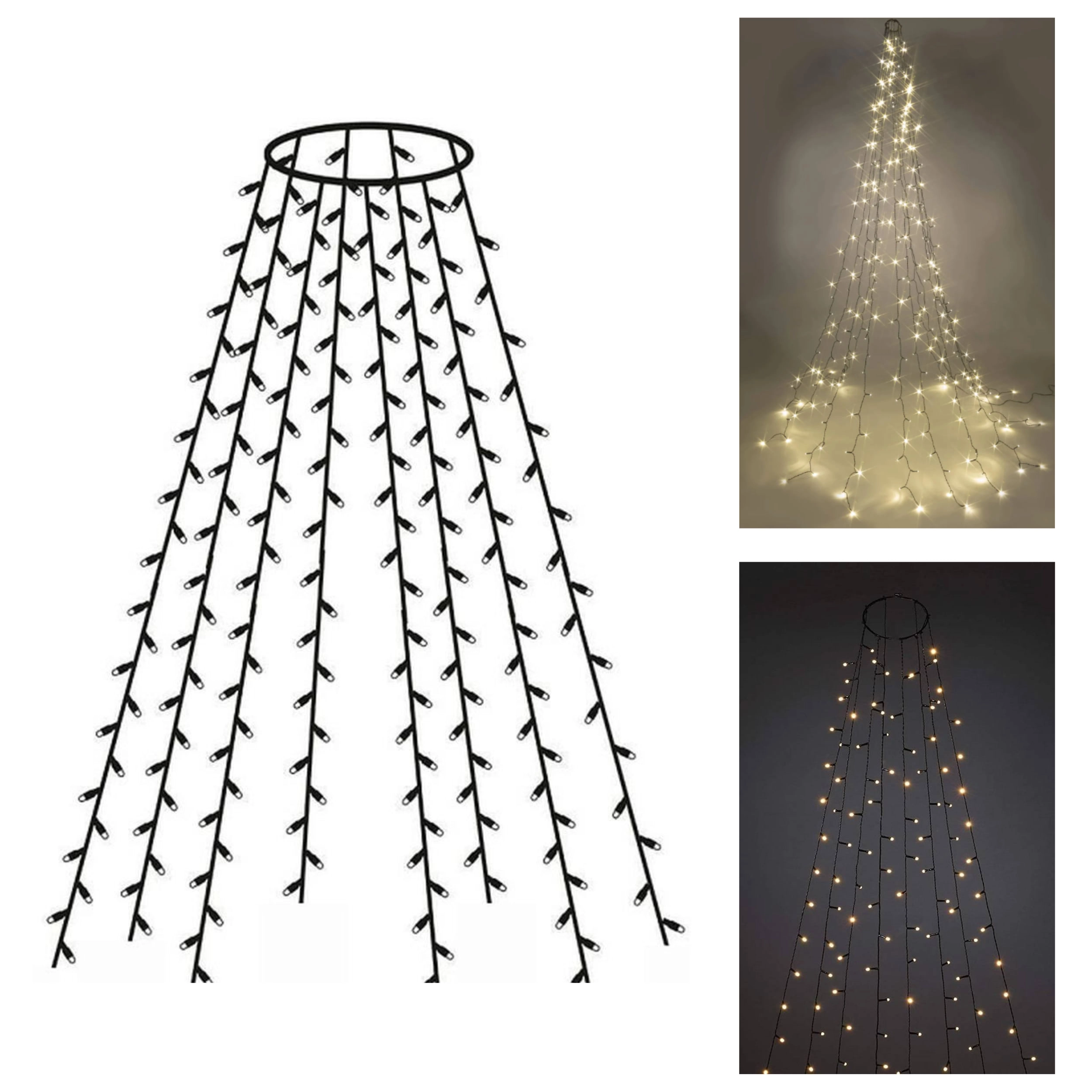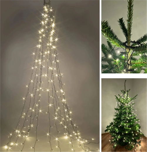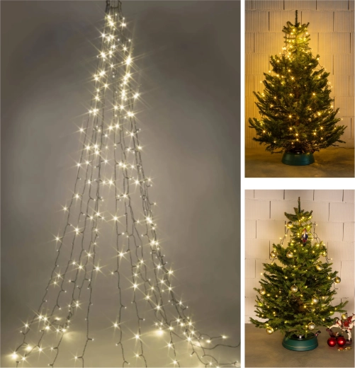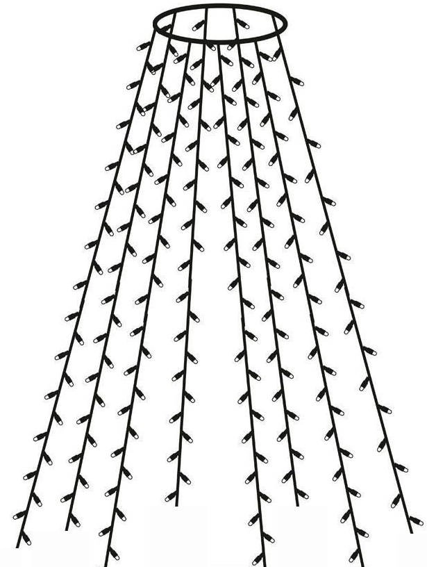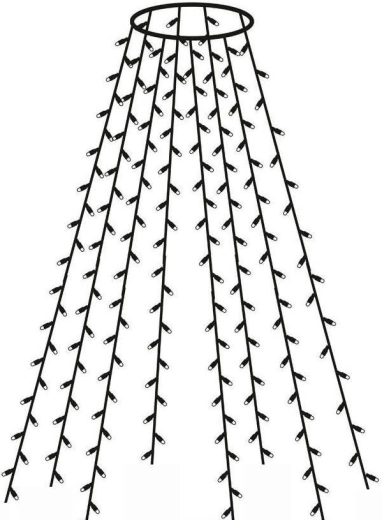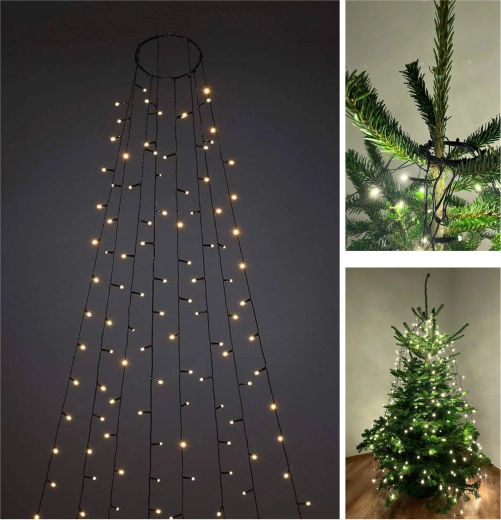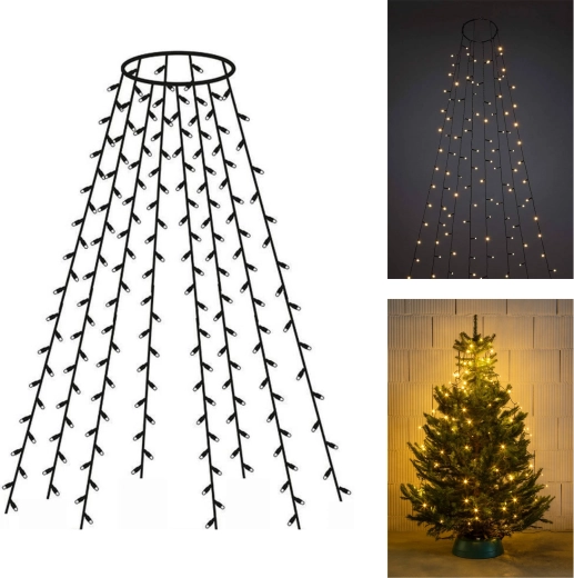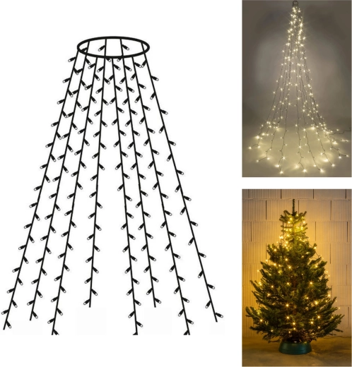 Változtassa karácsonyfáját otthona ragyogó középpontjává. A 300 LED-es, meleg fehér fényű függöny pillanatok alatt felszerelhető – elég a fémgyűrűt a fa csúcsára helyezni, majd szétteríteni a 12 szálat, melyek hossza kb. 2,5 m. A 6/18 órás időzítőnek köszönhetően a fények automatikusan be- és kikapcsolnak, így energiát és időt takarítanak meg.