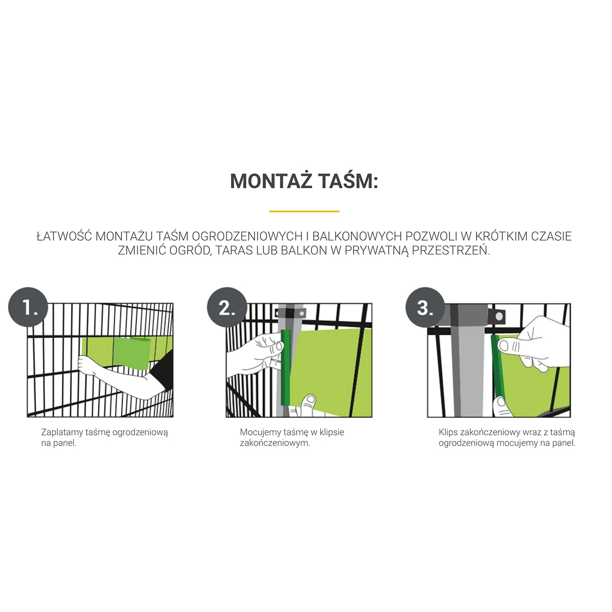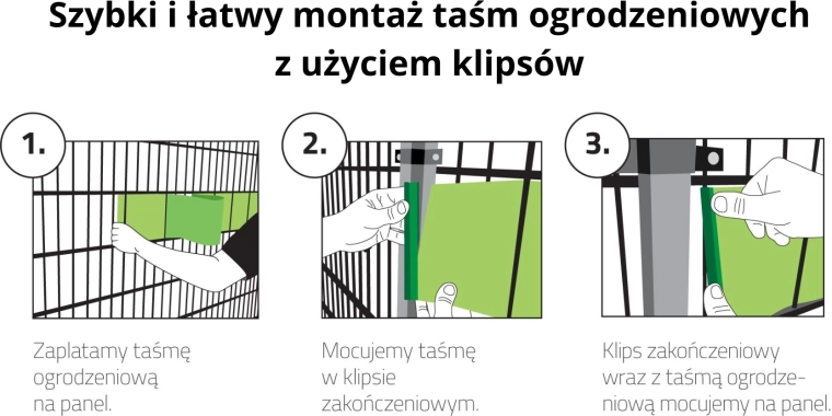 A szerelés pillanatok kérdése: a szalagot a klipszbe tolni, majd a panelre bepattintani. A pontos leszorítási tűrésnek köszönhetően a klipsz szorosan felfekszik a huzalbetétekre (4–6 mm), és legfeljebb 19 cm széles szalagokhoz illeszkedik, beleértve a PROTECTO típusú rendszereket is. A 10 db-os készlet elegendő egy kerítésszakasz vagy egy kiskapu gyors befejezéséhez.