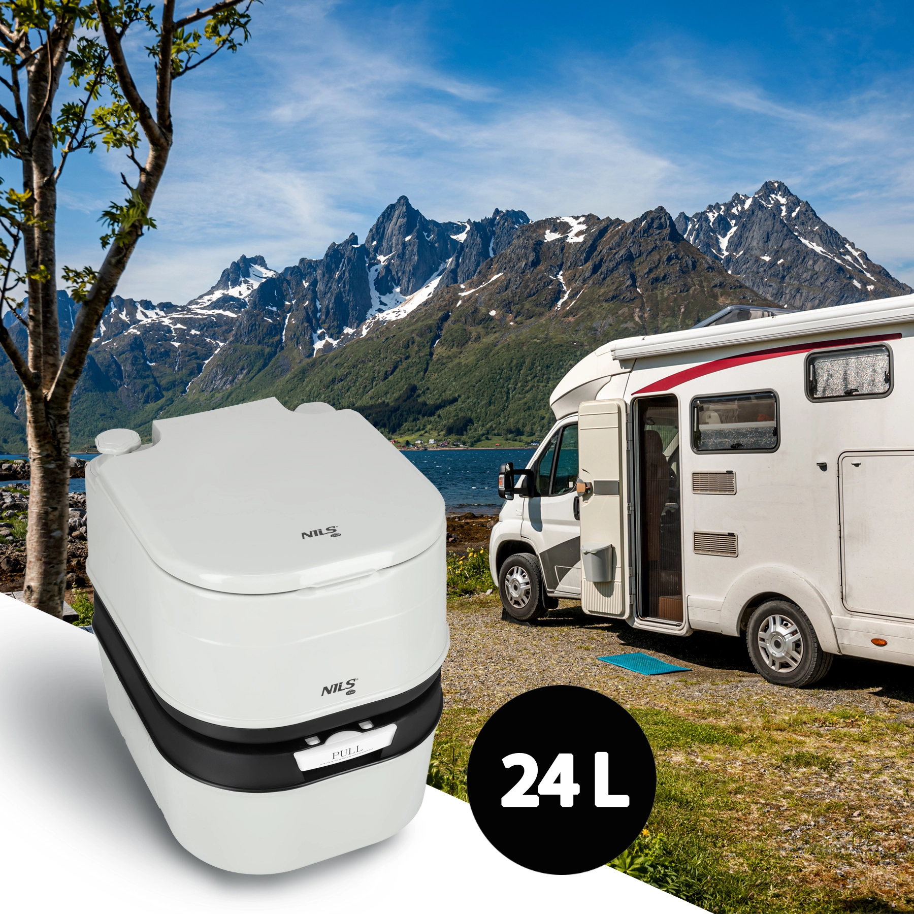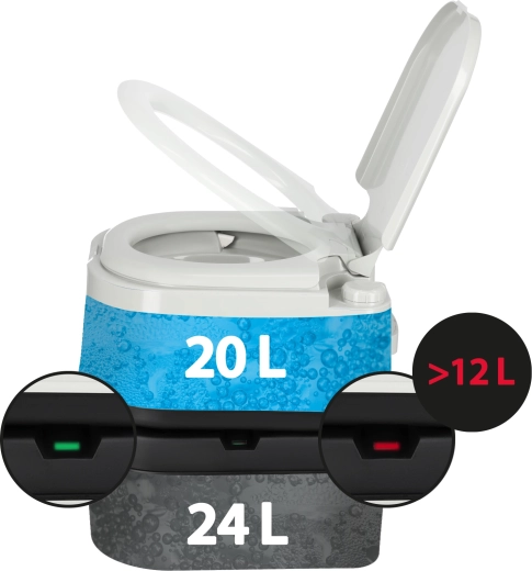 Élvezze az utazás szabadságát a NILS Camp WC-vel, amely ötvözi a nagy kapacitást, az egyszerű használatot és a higiénikus kialakítást. Két különálló tartálya (20 l tiszta vízhez és 24 l szennyvízhez) gondtalan használatot tesz lehetővé több napon át, miközben a töltöttségjelző időben figyelmeztet az ürítés szükségességére.