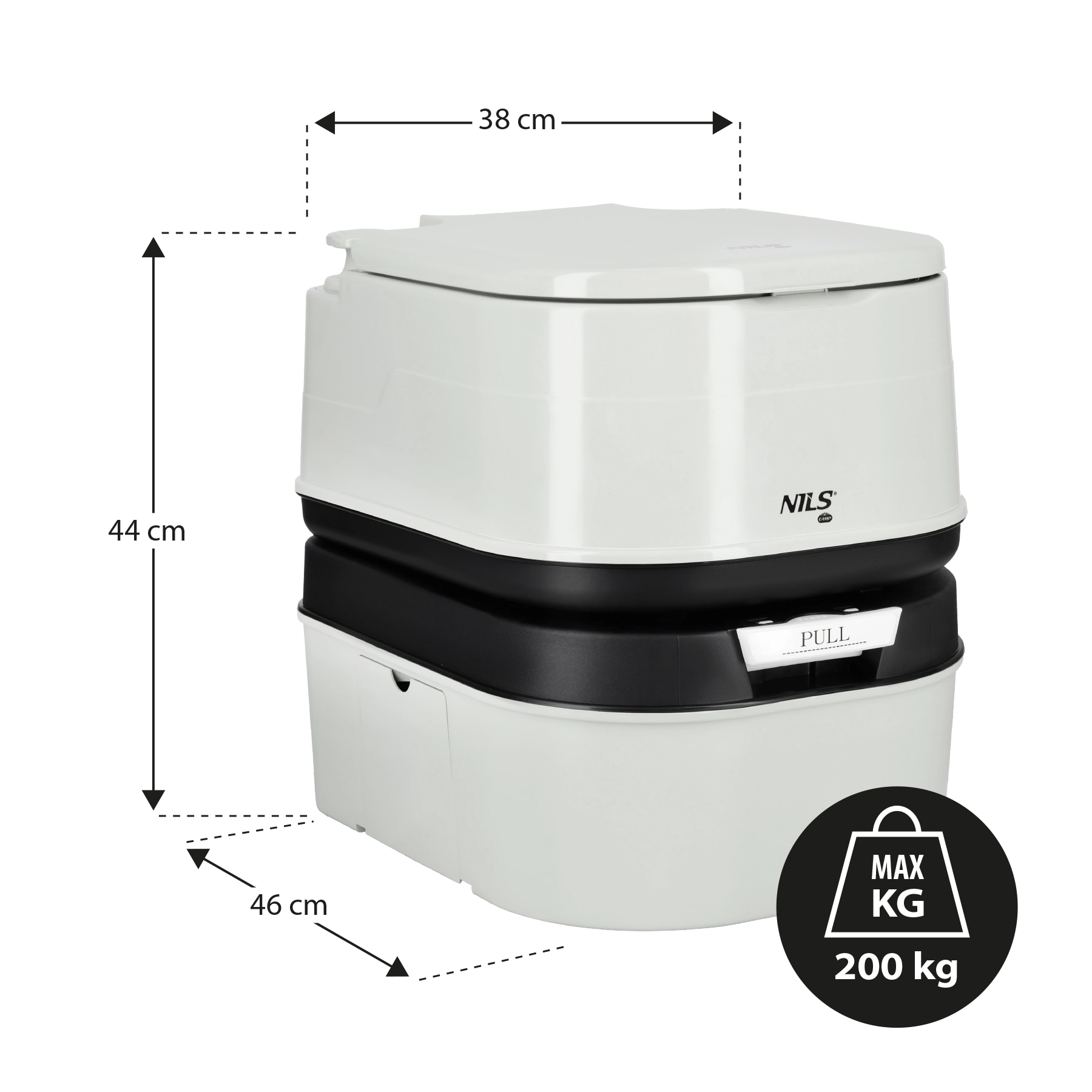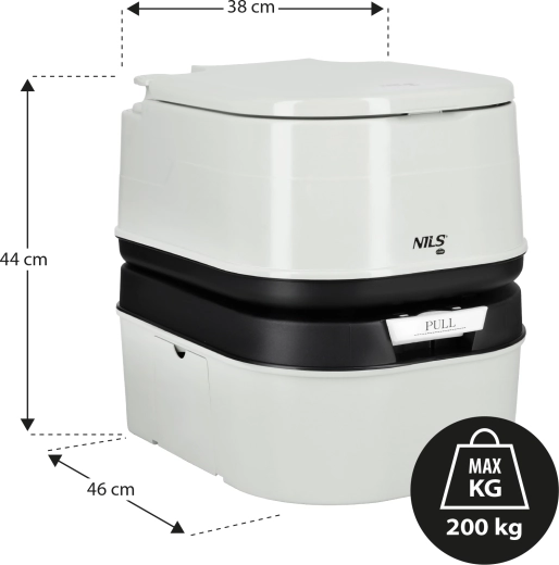 A NILS Camp hordozható WC 24 l-es szennyvíztartállyal és 20 l-es frissvíztartállyal maximális kényelmet, hosszú használatot ürítés nélkül és töltöttségjelzőt kínál. A kézi öblítésnek, a tömített tolózárnak és a strapabíró kialakításnak köszönhetően ideális kempingezéshez, lakóautóba, hajóra, illetve tartalék megoldásként.