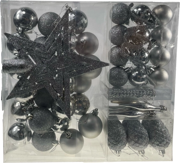 Elegáns, 48 darabos karácsonyi dísz szett egységes ezüst színben, amely klasszikus és ünnepi megjelenést kölcsönöz a fának. A könnyű műanyag anyag törésálló, amit a kisgyermekes családok különösen értékelnek. A készlet különböző formájú és méretű gömböket, gyöngy girlandot és csillag alakú csúcsdíszt tartalmaz a teljes és harmonikus dekorációhoz.
