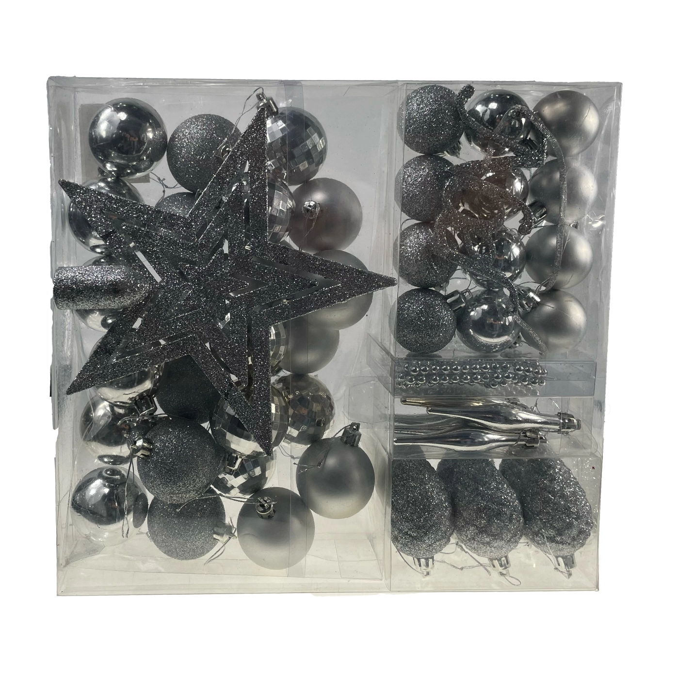 Varázsoljon tökéletesen összehangolt díszítést karácsonyfájára! Ez az átfogó, időtálló ezüst színű szett a ragyogást és eleganciát ötvözi, így modern és hagyományos enteriőrökbe egyaránt illik. A könnyű és strapabíró műanyagnak köszönhetően a díszek biztonságosak, egyszerűen felakaszthatók, és kevésbé sérülékenyek a használat során.