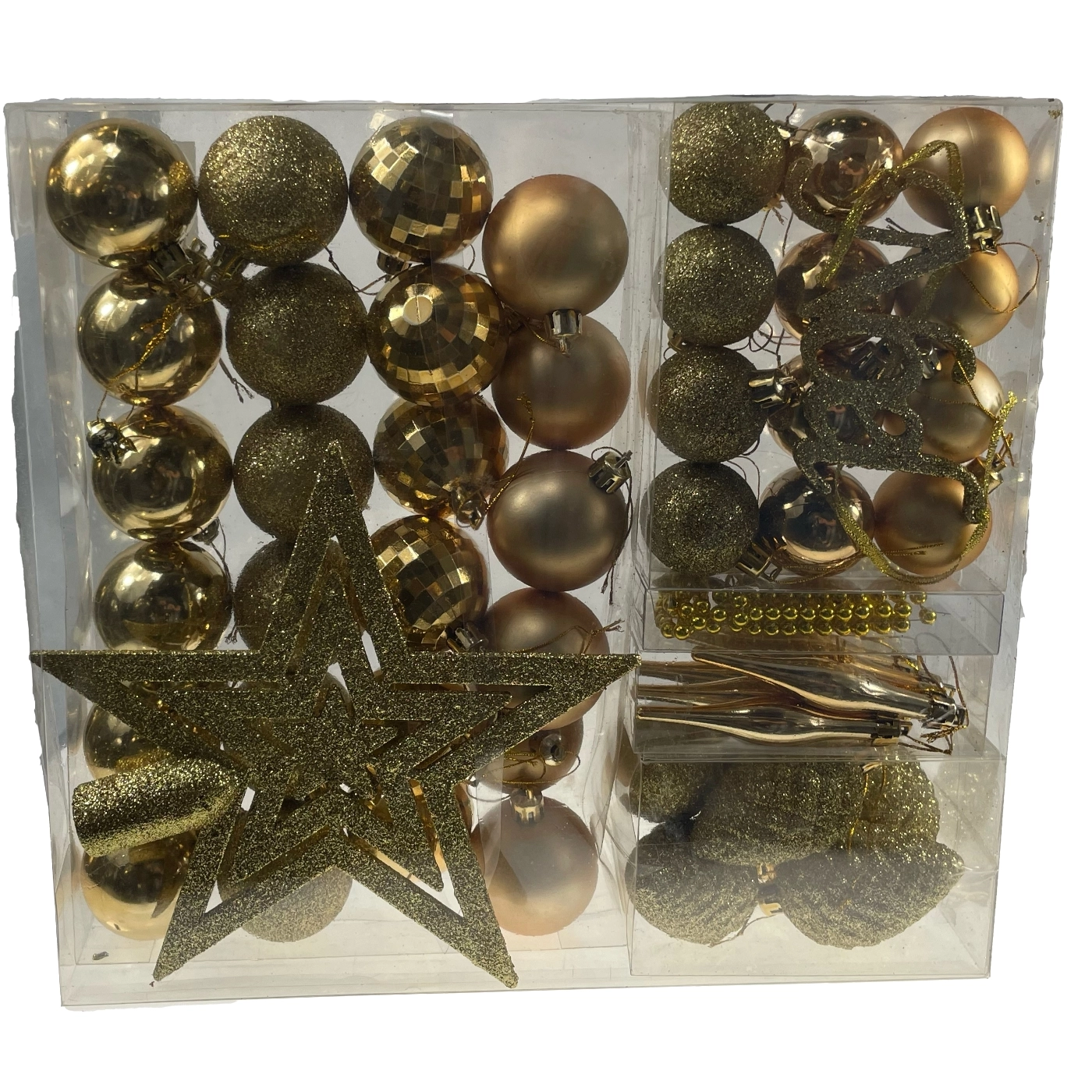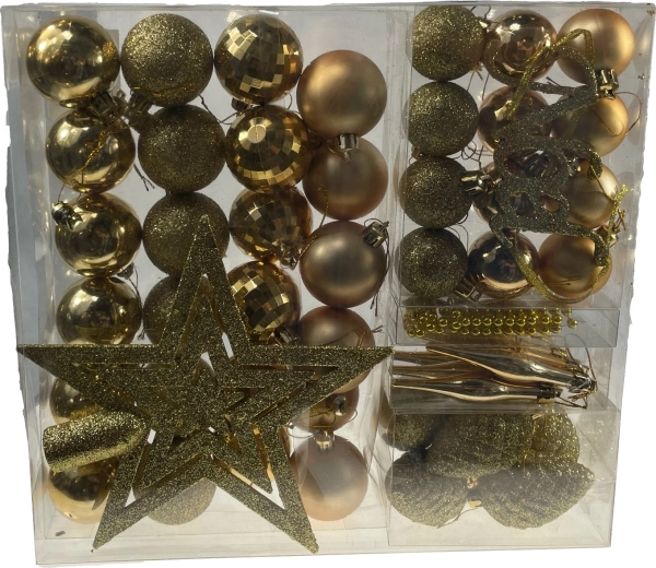Adj különleges ragyogást a fádnak a 48 darabos arany karácsonyfadísz-készlettel. A csomagban különböző méretű és formájú gömbök, egy nagy arany csúcsdísz csillag és egy arany gyöngyfüzér található. Minden könnyű és tartós műanyagból készült, amely biztonságos gyermekes háztartásokban is, és ellenáll a törésnek. Az elegáns arany szín remekül kombinálható pirossal, zölddel és fehérrel, így a fán egységes, luxus hatást kelt.