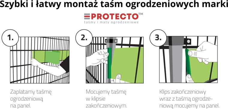 Válassza ki pontosan annyi szalagot, ahány sor és mező a kerítésén van, majd azonnal fűzze be a drótok közé. A szalagok klip nélkül is szilárdan a helyükön maradnak, ugyanakkor 2 db KLIP INGYEN jár minden darabhoz az élek végső rögzítéséhez, ha szükséges.