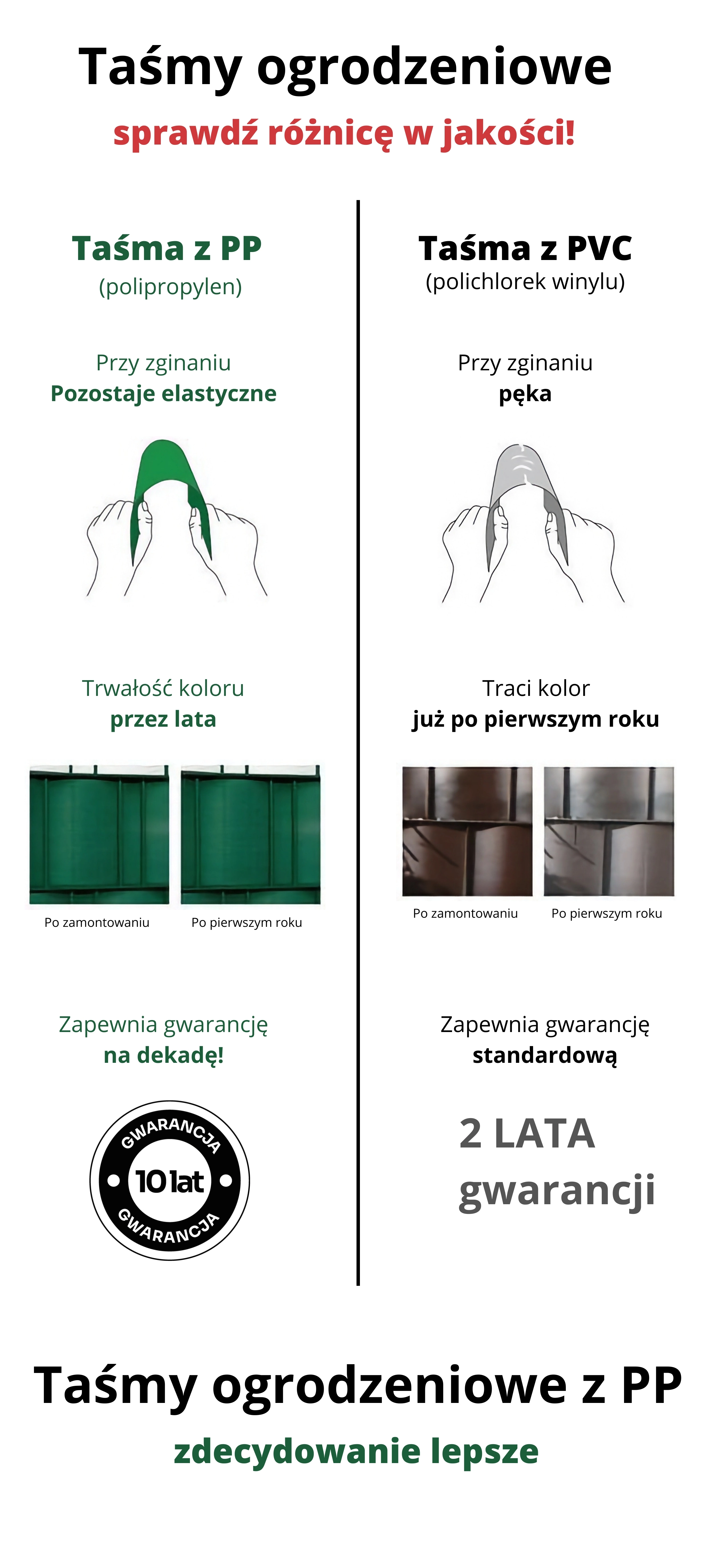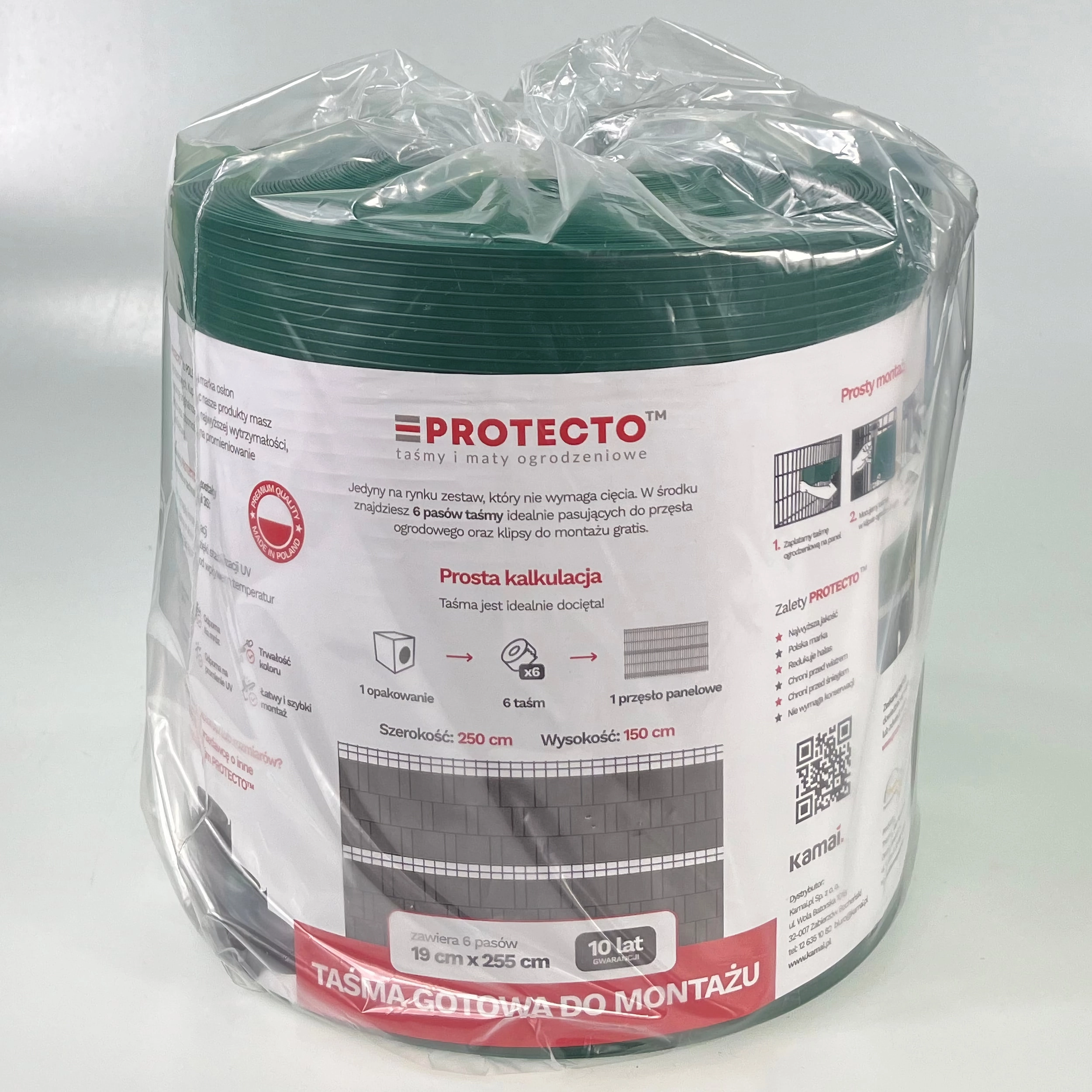 Felejtse el a bonyolult méregetést és a tekercsből történő vágást. A SMART előre vágott szalagok hossza 2,55 m – ideális egy kerítéspanel-sorhoz. A tartós PP (polipropilén) megőrzi a RAL 6005 (zöld) színt, nem degradálódik a napfényben, és kiválóan ellenáll a szélnek, fagynak és nedvességnek. A szerelés saját kezűleg pár perc alatt elvégezhető.