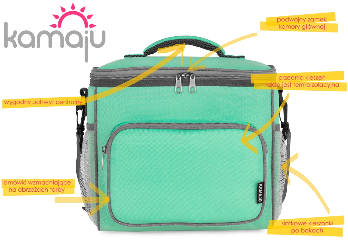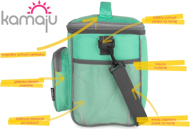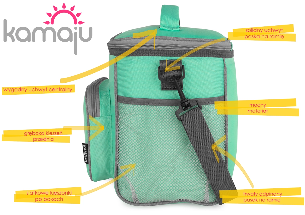 A praktikus és stílusos KAMAJU hűtőtáska hosszú ideig hidegen vagy melegen tartja az ételeket és italokat. Tágas fő rekeszt, termoizolált első zsebet, két oldalsó hálós zsebet kínál, és kényelmes hordozást biztosít a állítható vállpántnak és a puha felső fogantyúnak köszönhetően. Ideális ebédhez, piknikhez, bevásárláshoz és utazáshoz.