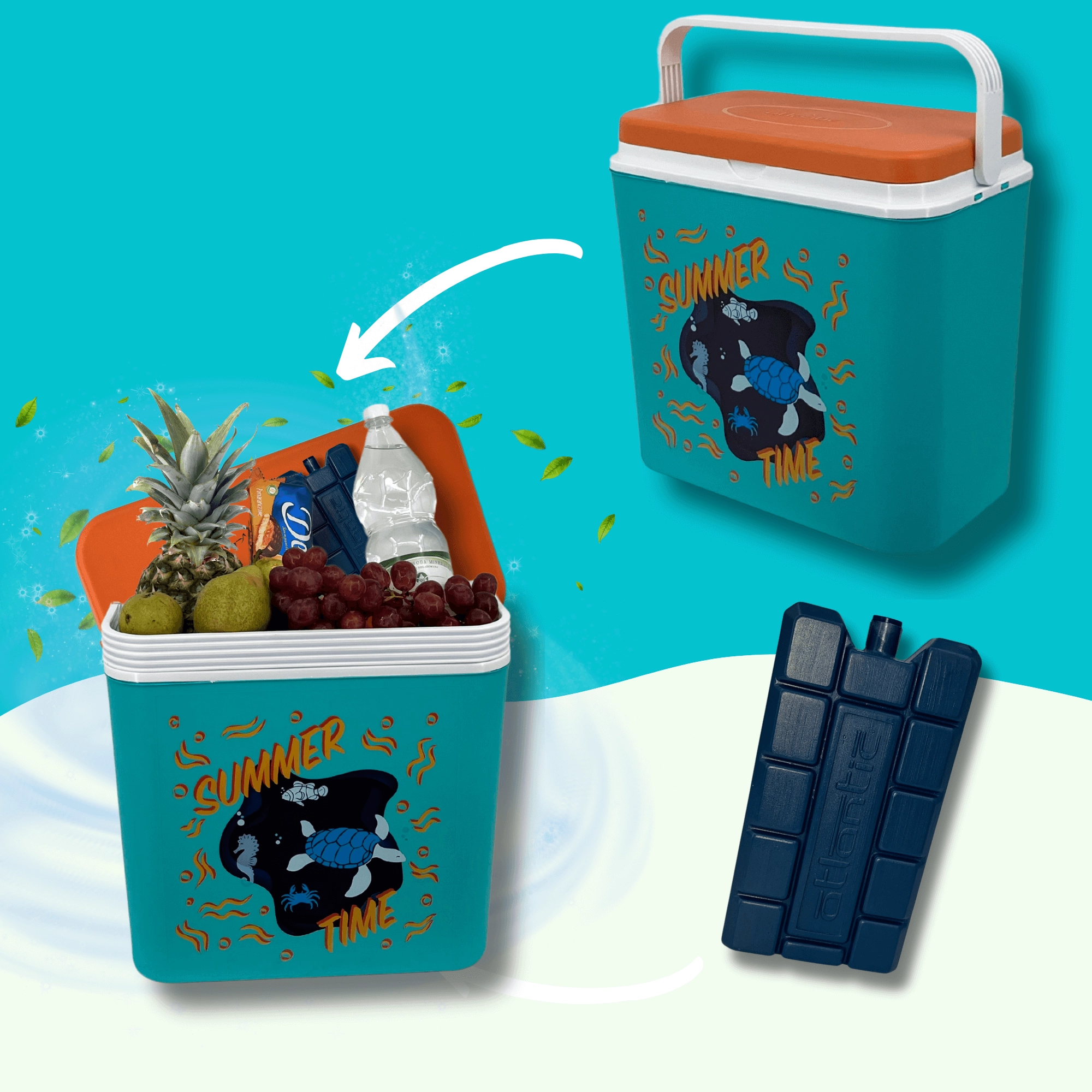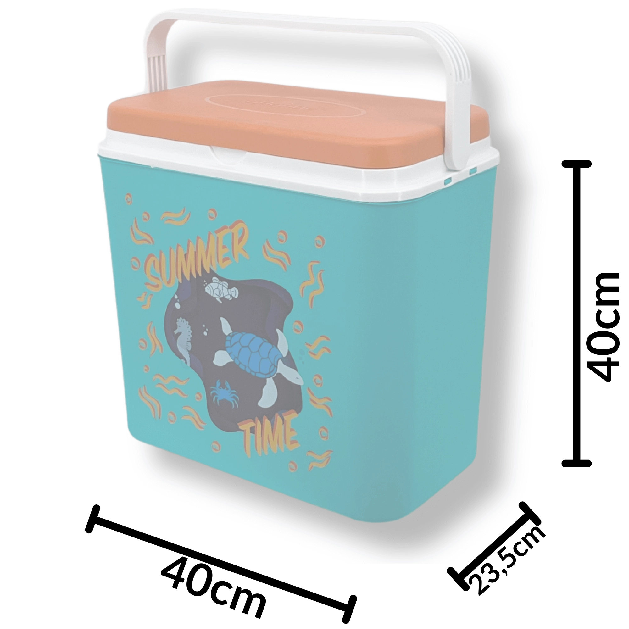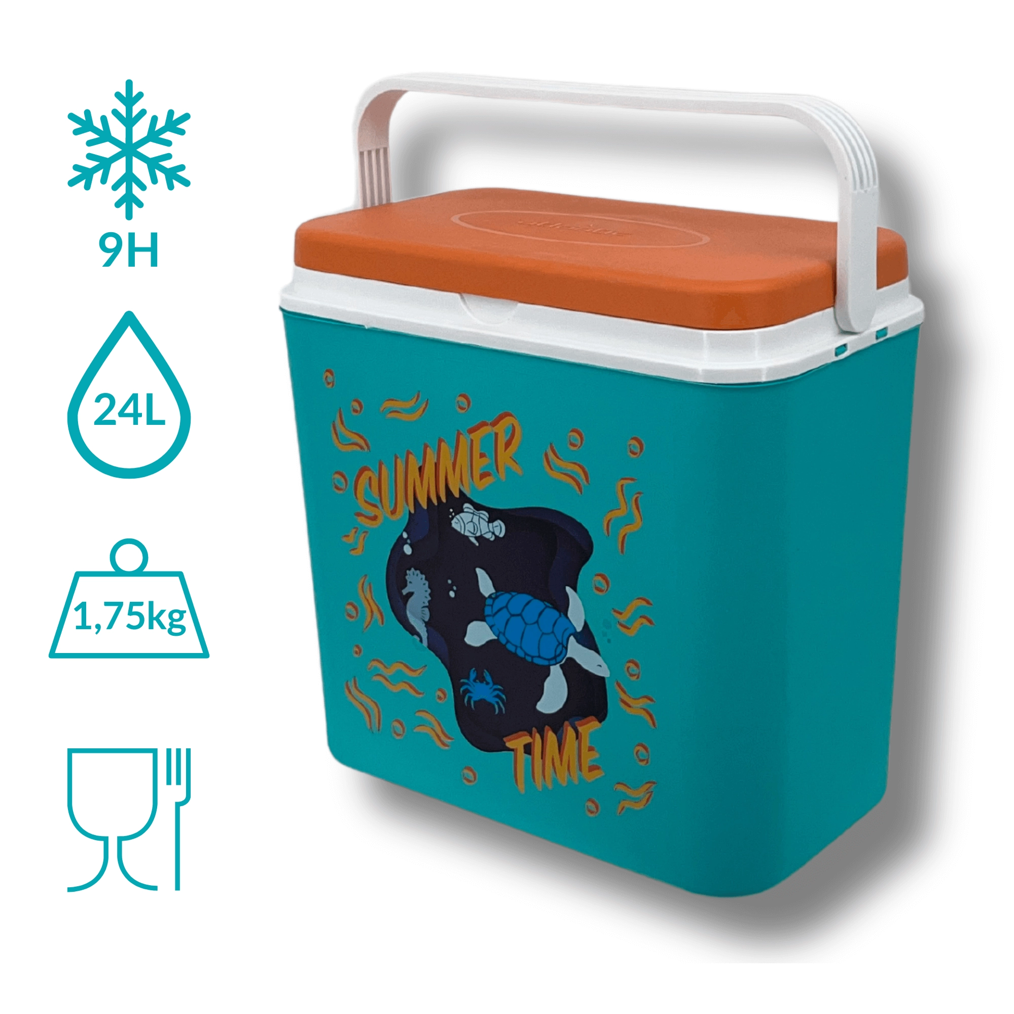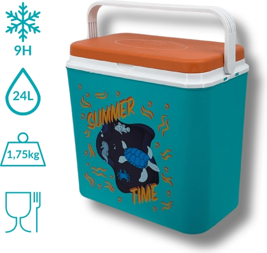 Stílusos hordozható hűtődoboz KAMAI ATLANTIC 24 l, amely az fejlett szigetelésnek és a hűtőbetétek használatának köszönhetően tovább hidegen tartja ételeit és italait. A kompakt méretek megkönnyítik a szállítást autóban, lakóautóban vagy hajón, míg az erős fogantyú kényelmes hordozást biztosít. A tengeri állatok motívumával és a SUMMER TIME felirattal díszített nyári design üdülős hangulatot kölcsönöz minden kirándulásnak. EU-ban készült, élelmiszerrel érintkezésre alkalmas.