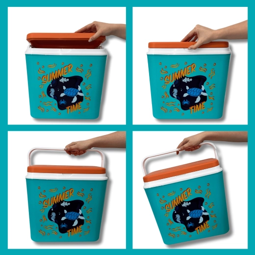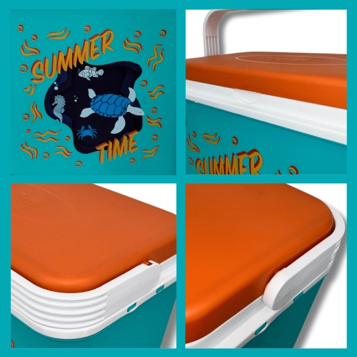 A tartós polipropilénből készült doboz könnyen tisztítható, kompakt kialakítása pedig elfér autóban, lakóautóban és csónakban is. A belső magasság lehetővé teszi egy 2 l-es palack függőleges elhelyezését; belül akár nyolc 1,5 l-es vagy három 2 l-es palack is elfér egymás mellett. A teknőst és csikóhalat ábrázoló nyári minta és a kontrasztos fedél vonzó megjelenést ad a doboznak.