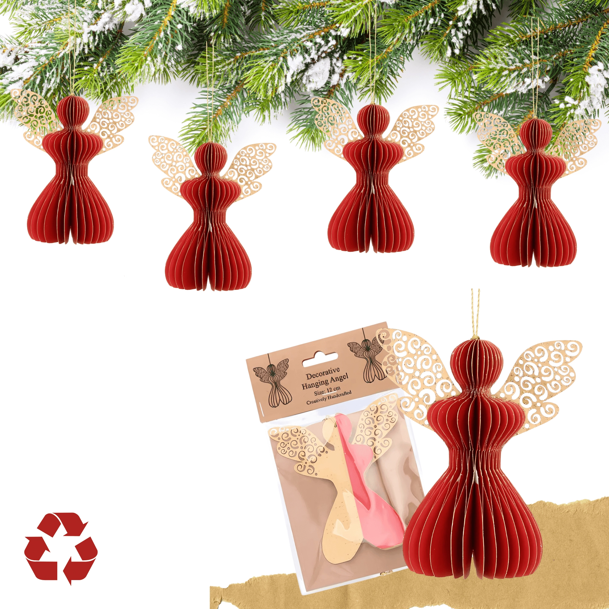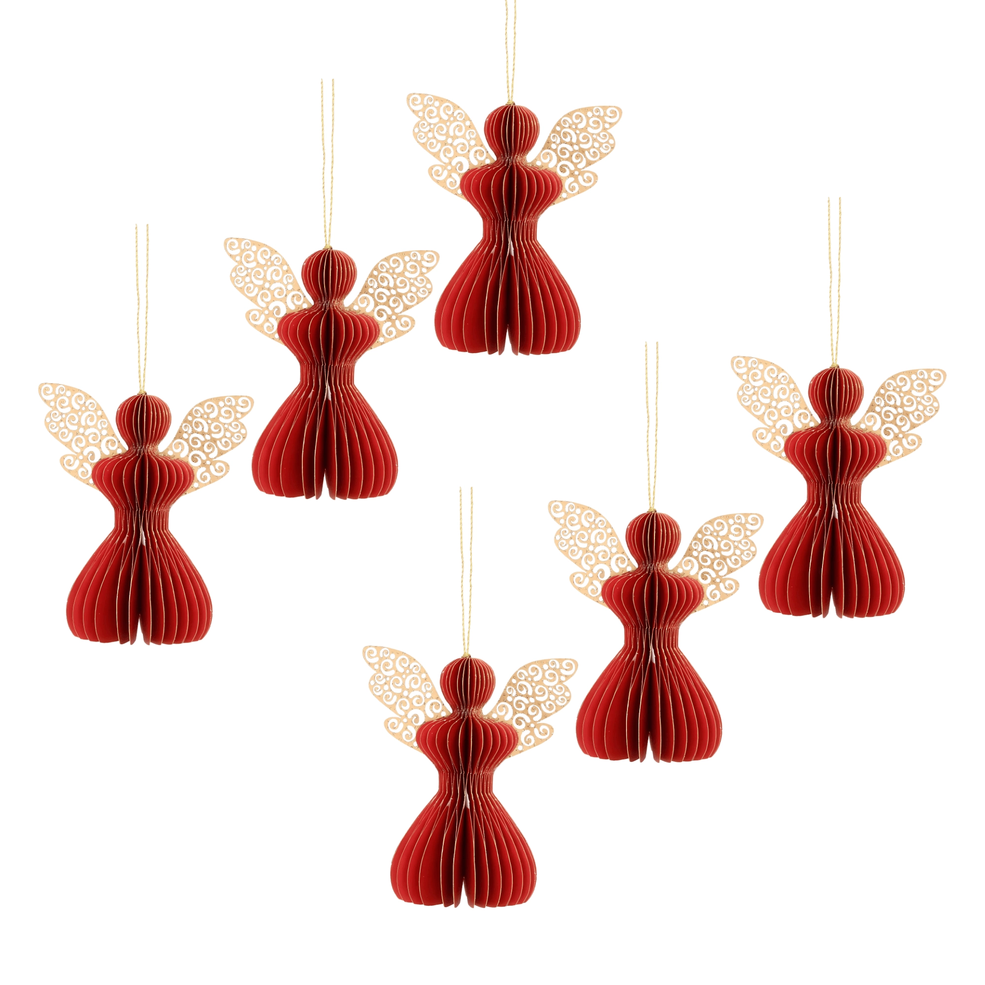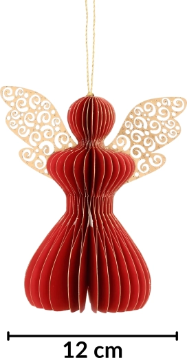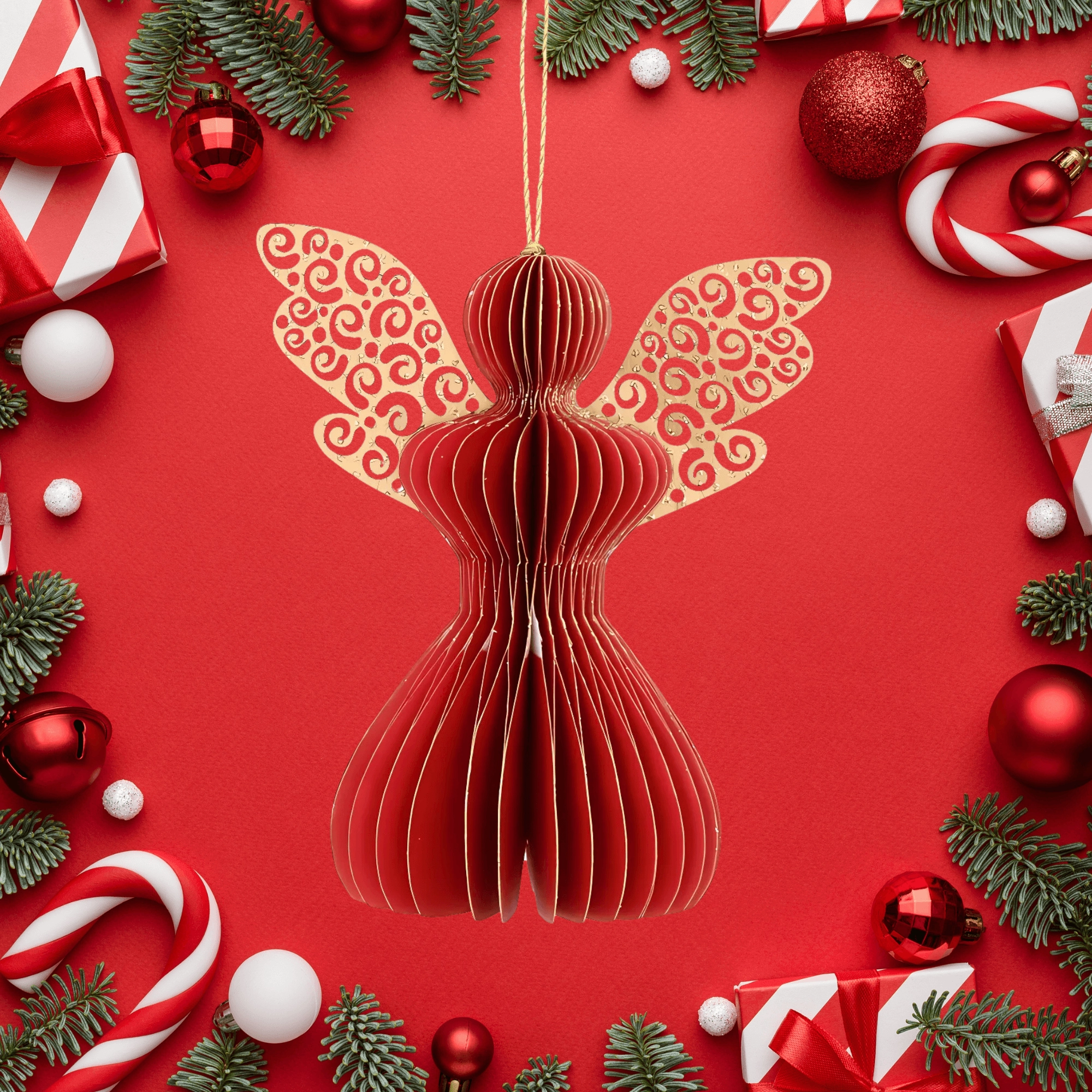 A piros papír angyalka sokoldalú karácsonyi dekoráció, amely illik a klasszikus és modern enteriőrökhöz egyaránt. A könnyű méhsejt (összehajtható) dizájnnak köszönhetően egyszerűen felakasztható, és látványos 3D hatást kelt. Használható a karácsonyfán, koszorún, ablakban, vagy az ünnepi asztal finom kiegészítőjeként.