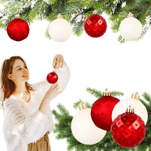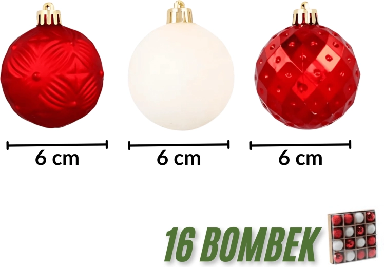Elegáns szett 16 darab, 6 cm átmérőjű piros karácsonyi gömbbel könnyű, törhetetlen műanyagból a biztonságos és tartós használatért. A felületek kombinációja – fényes, matt és csillámos – harmonikus, klasszikus karácsonyi díszítést teremt. Ideális a karácsonyfára, girlandokra és koszorúkra, kiváló választás gyermekes vagy kisállatos otthonokba is.