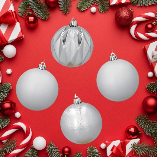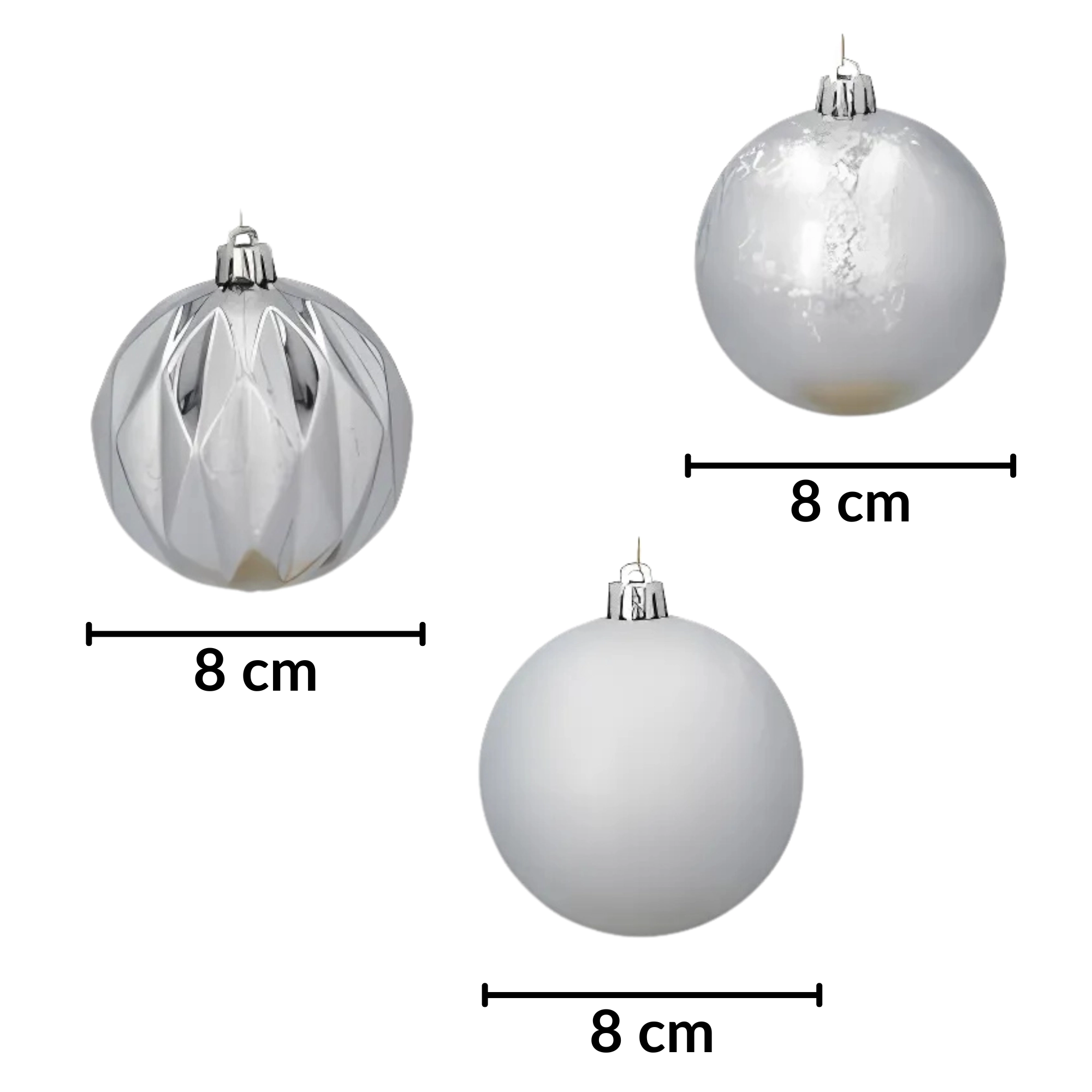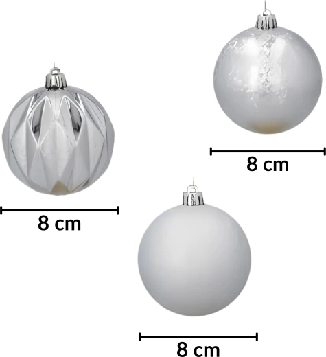 Add meg a karácsonyfának az elegancia és csillogás fényét ezzel a négy darabos, 8 cm átmérőjű ezüst gömb szettel. A különböző felületkezelések és minták remekül illenek modern és hagyományos stílushoz egyaránt, és harmonikus ünnepi hangulatot teremtenek bármely enteriőrben.