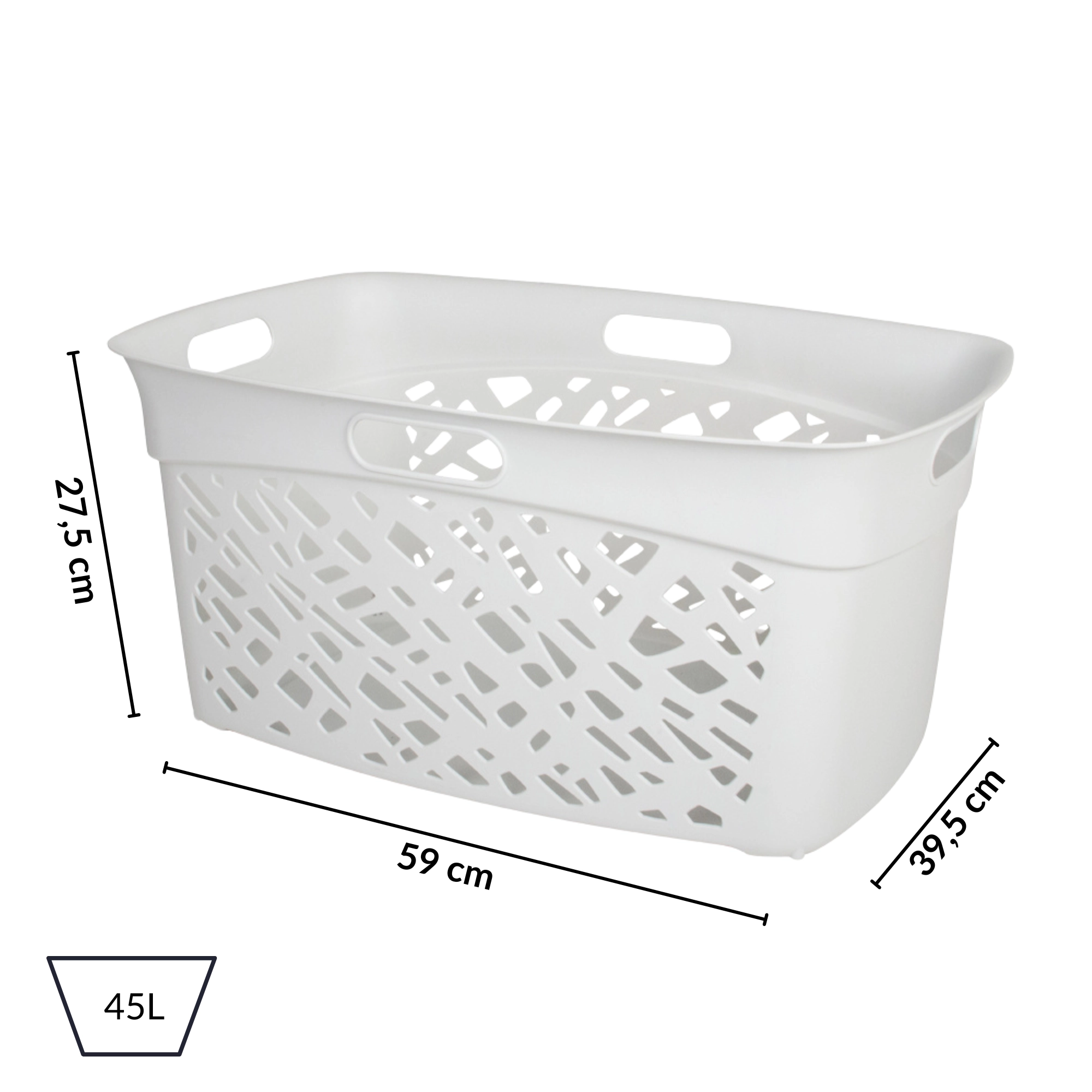 Az ALMERIA 45 l szennyeskosár stílusos és funkcionális megoldás a mindennapi válogatáshoz és ruhaszállításhoz. Az aszimmetrikus perforáció biztosítja a levegő áramlását, amely csökkenti a nedvességet és a szagokat, míg a letisztult vonalak könnyedén illeszkednek a modern és klasszikus enteriőrökbe.