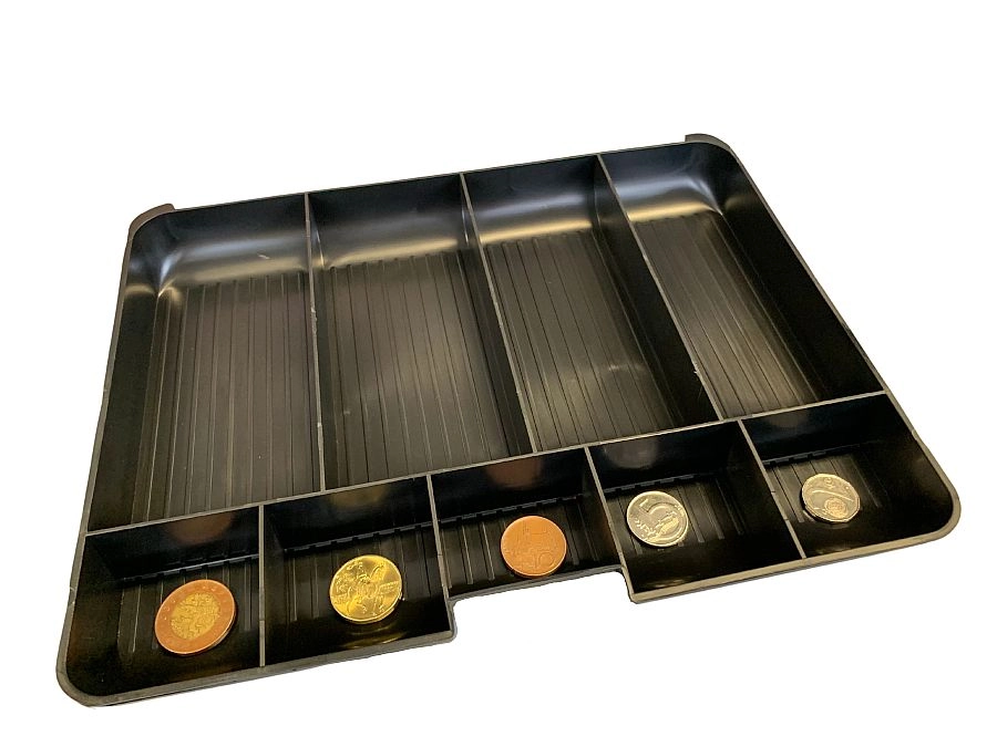 A belső érmerendező áttekinthetően elkülönítve tartja az aprópénzt, alatta pedig helyet biztosít a bankjegyeknek és dokumentumoknak.