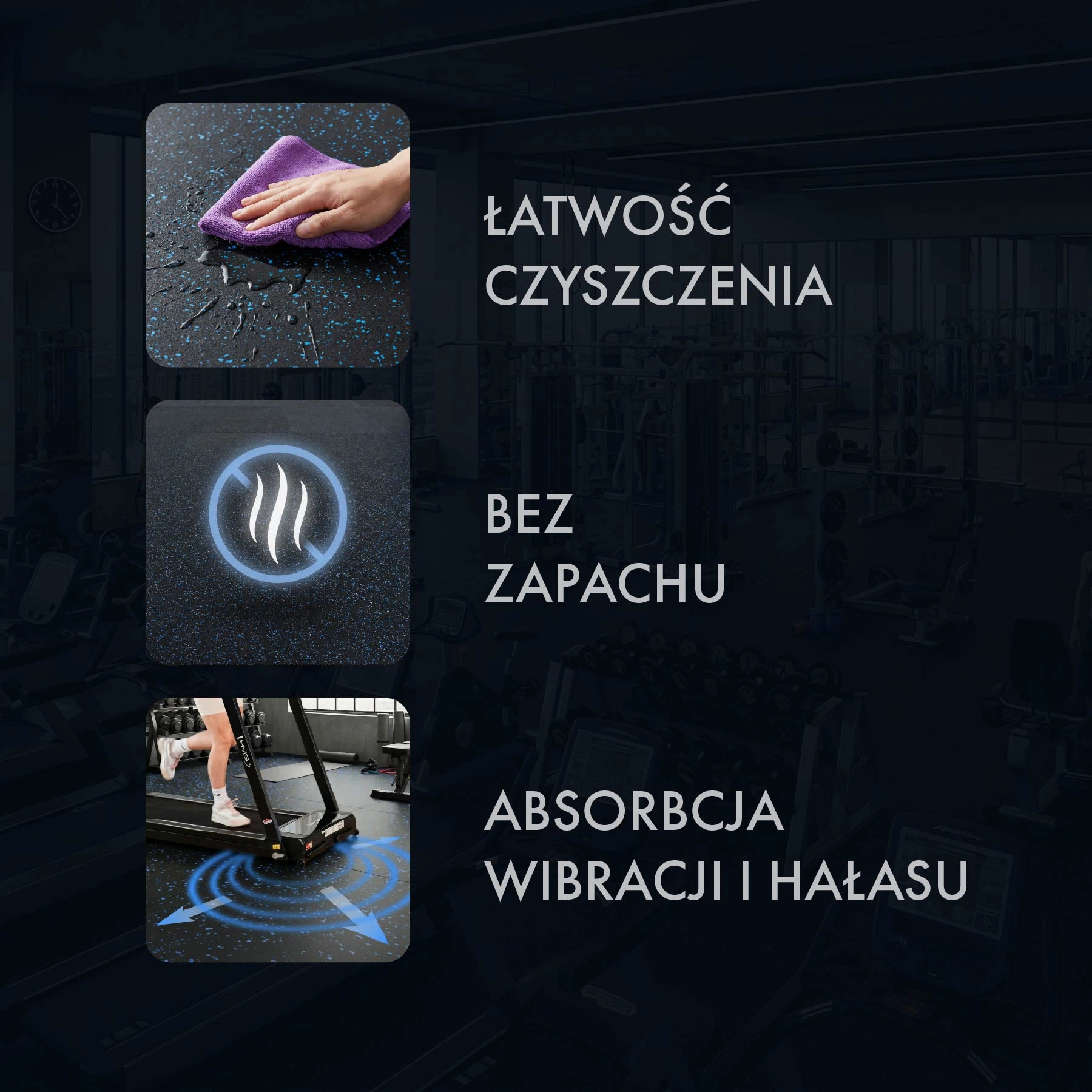 Minden egyes, 1 × 1 m méretű lap szerelő összekötőkkel kapcsolódik, amelyek megakadályozzák az elmozdulást, síkban tartják a felületet, és lehetővé teszik a gyors szerelést és szétszerelést. Kiváló választás cardio- és erőgépek alá, szabad súlyos zónákba, valamint otthoni edzőtermekbe.