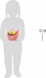 Ez a minőségi készlet egy kockás bélésű fonott kosarat és fa gyümölcs- és zöldségdarabokat tartalmaz (eper, répa, padlizsán, kukoricacső, alma, banán stb.). Az elemeket tépőzár köti össze, így a gyerekek biztonságosan „felvághatják” a fa késsel és újra összerakhatják. Tökéletes kiegészítő a gyerekkonyhába és a bevásárlós standhoz is.