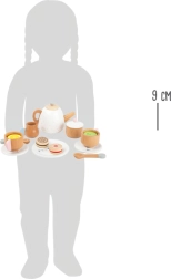 Ez a szépen kidolgozott gyermek teázó készlet lehetővé teszi a kis házigazdáknak, hogy vendégeiket bájos csészékkel, kannával és egyéb kiegészítőkkel szolgálják ki. A magas minőségű masszív fa biztosítja a tartósságot és a játékok hosszú élettartamát, melyeket kifejezetten a gyermekkezekhez terveztek.