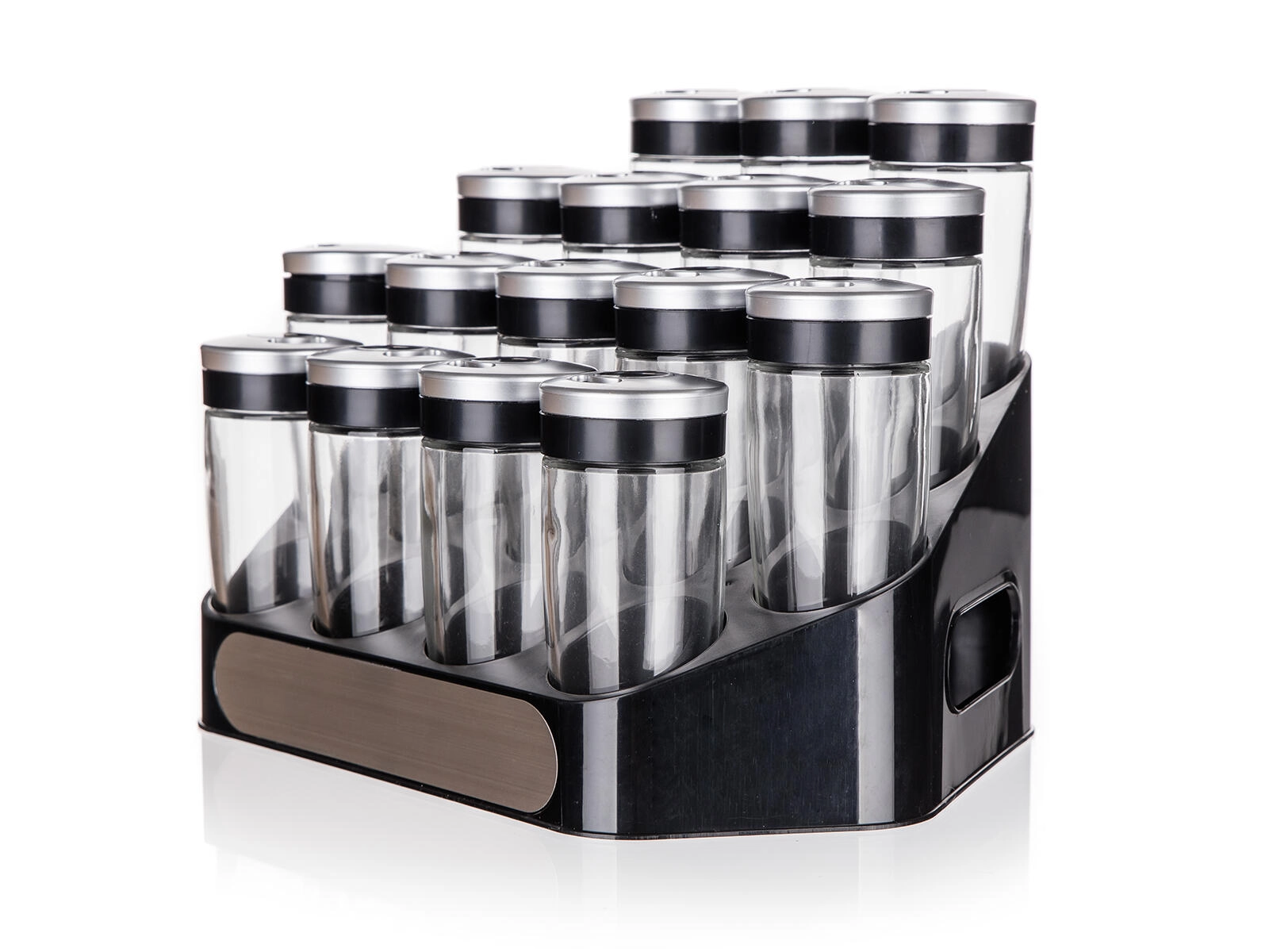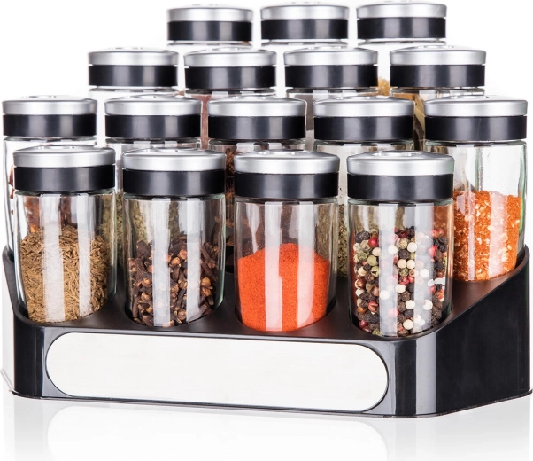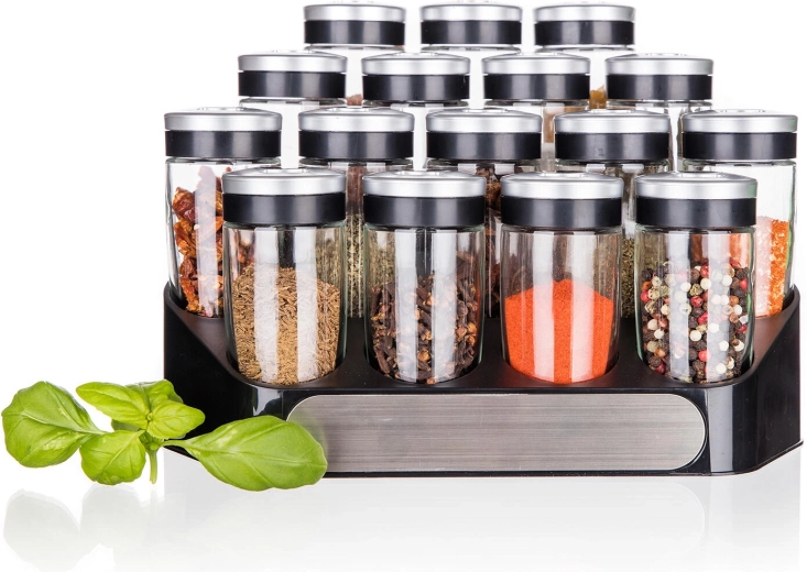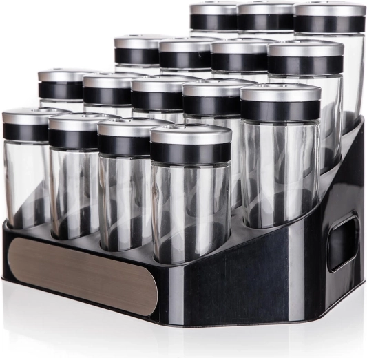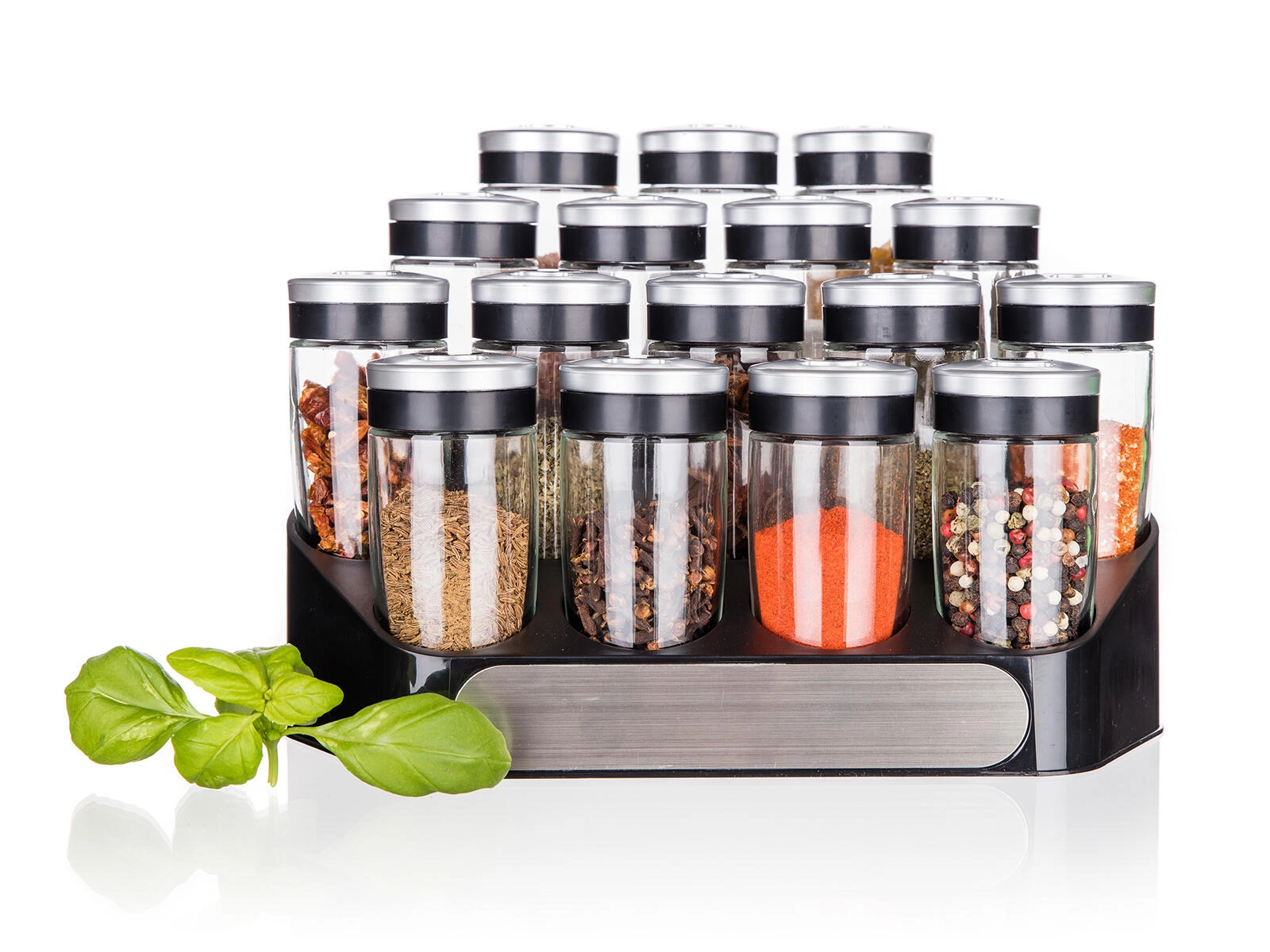 A stabil ABS állvány mind a 16 fűszertartót rendezetten és kézre esően tartja – ideális a konyhapultra vagy a kamrába.
