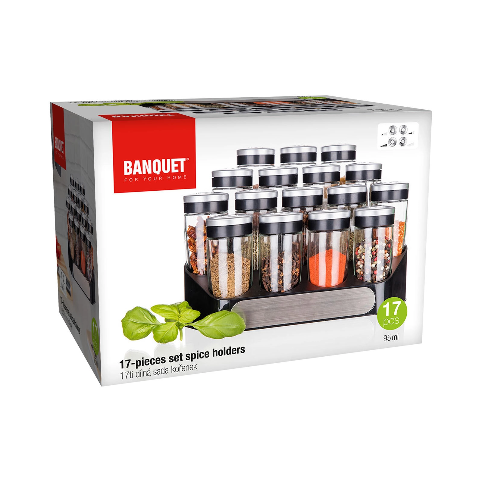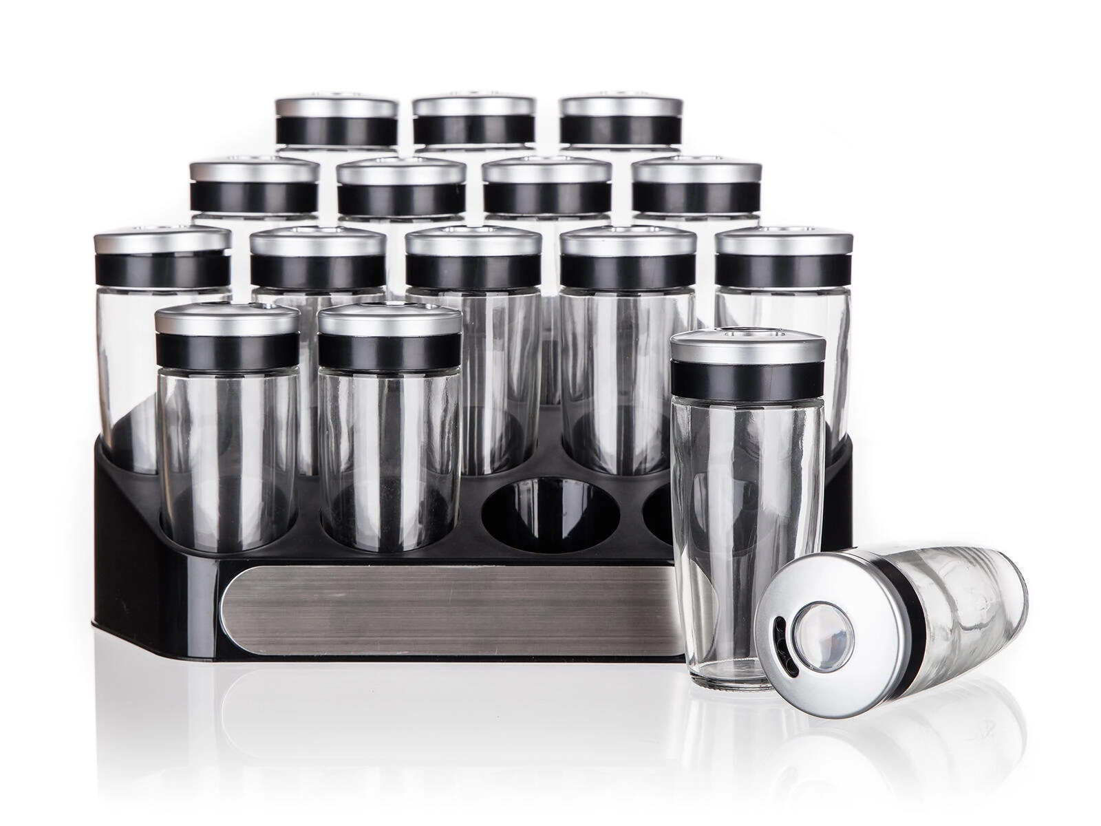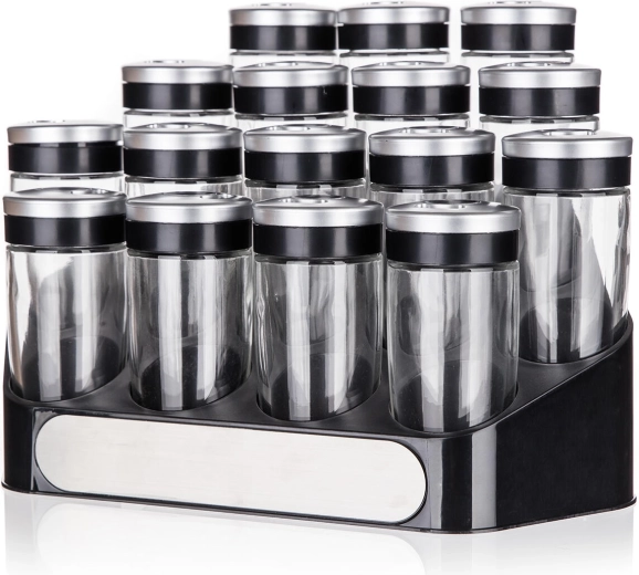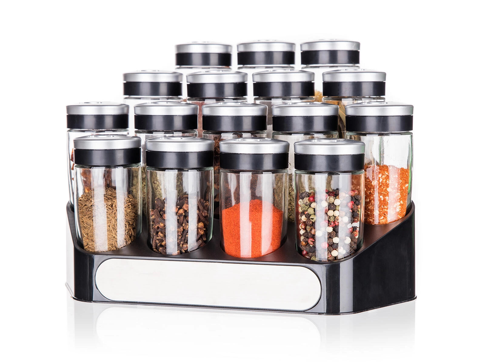 A stabil ABS állvány mind a 16 fűszertartót rendezetten és kézre esően tartja – ideális a konyhapultra vagy a kamrába.
