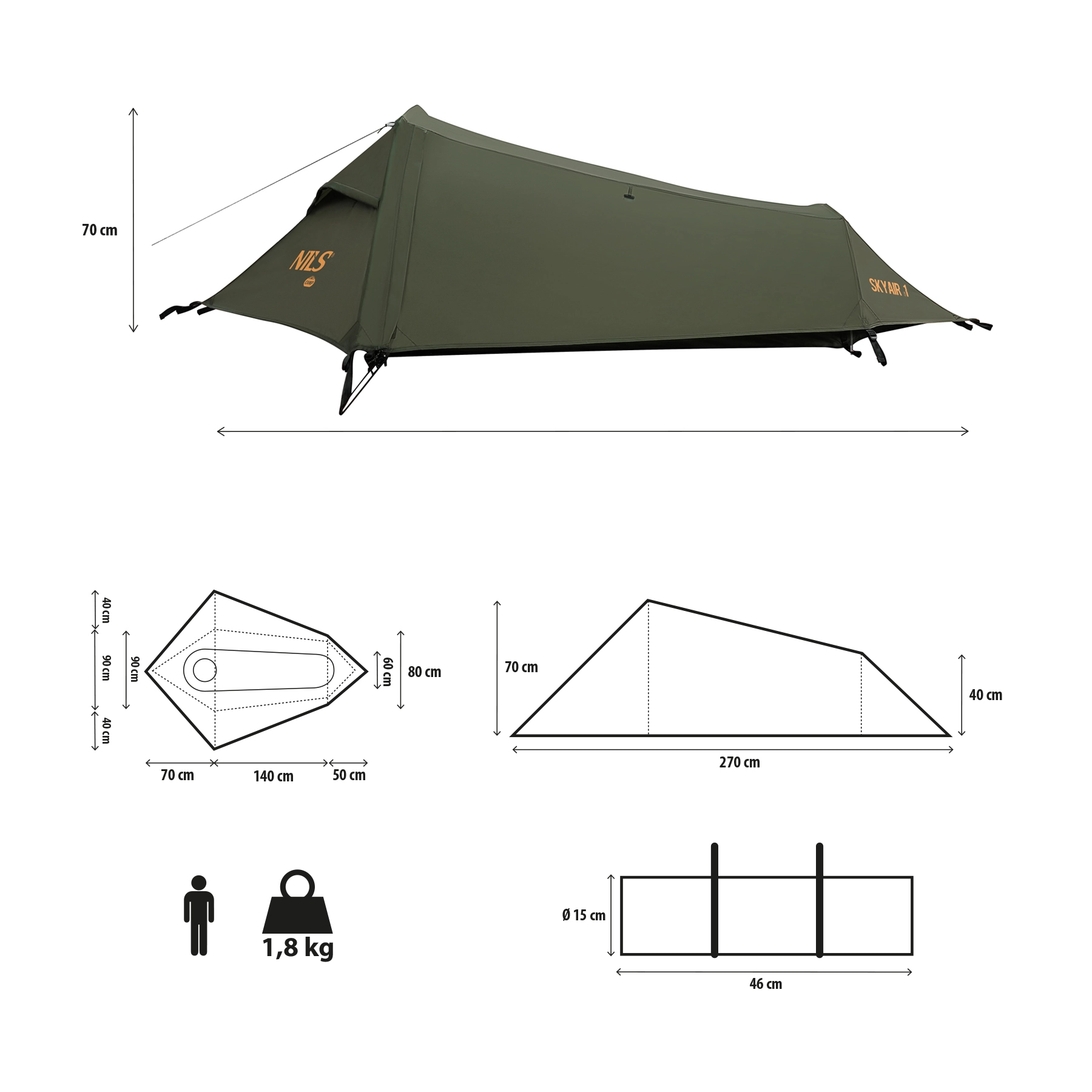 Ultrakönnyű egyszemélyes sátor kompakt csomagmérettel és gyors felállítással – ez a NILS CAMP Skyair 1. Kínál minimális, 1,8 kg-os tömeget, kiváló esőállóságot (külső sátor 3000 mm, sátoralj 5000 mm) és megbízható rovarvédelmet a no-see-um szúnyoghálónak köszönhetően. Ideális kerékpártúrákhoz, vízitúrákhoz és hegyi túrázáshoz.