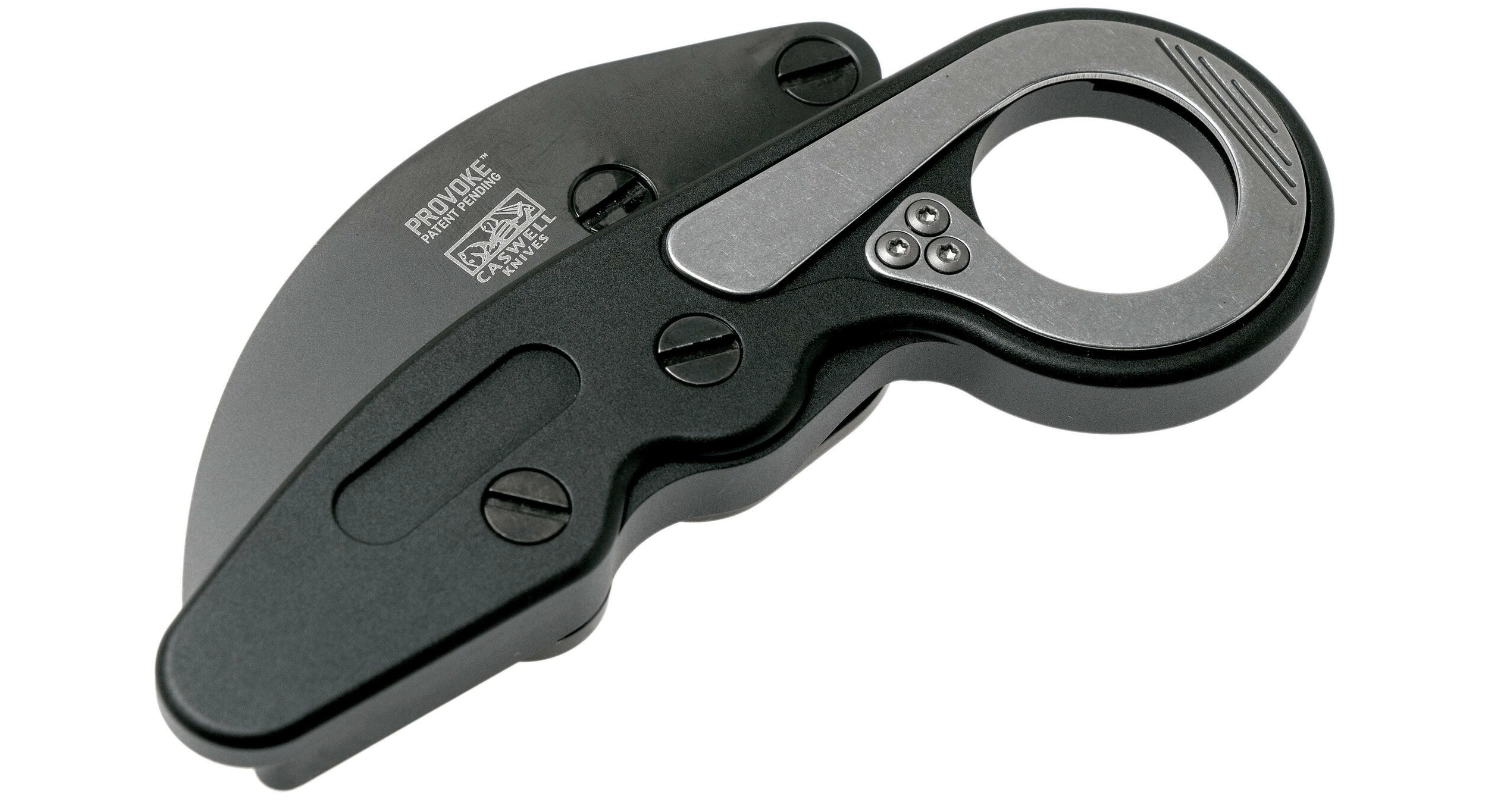 Az innovatív CRKT Provoke Black karambit Joe Caswell tervezőtől a taktikai védekezést ötvözi az EDC praktikummal. Ívelt D2 acél pengével rendelkezik matt, fekete titán bevonattal, valamint masszív 6061‑T6 alumínium markolattal és zsebklippel. Az egyedülálló karos mechanizmusnak köszönhetően egy kézzel nyitható és biztonságosan rögzíthető.