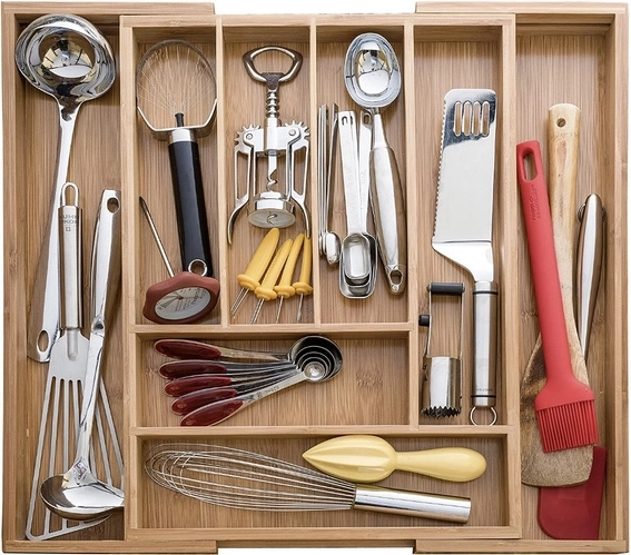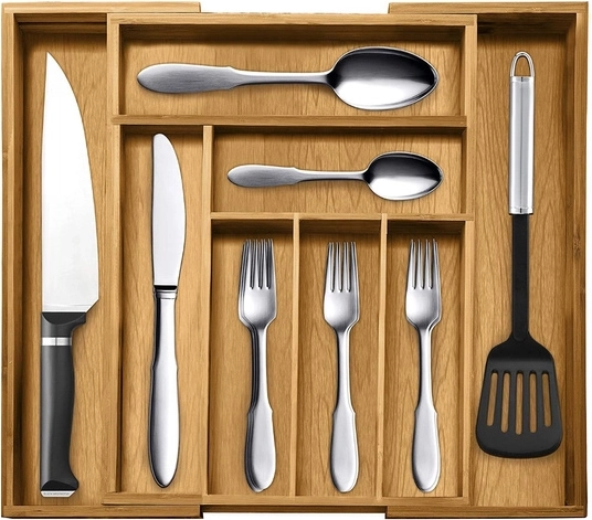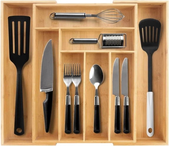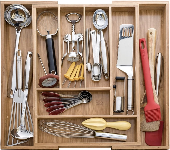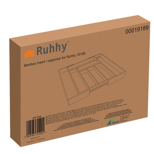 Tarts rendet a konyhafiókban a bővíthető bambusz rendezővel RUHHY. A természetes bambusz tartós, gyorsan szárad, és kevésbé nyeli el a baktériumokat. Az állítható szélesség 6–8 rekeszt biztosít kanalaknak, villáknak, késeknek és apró evőeszközöknek. A természetes dekor elegáns megjelenése illik minden konyhába, és áttekinthető, higiénikus tárolást biztosít a tartozékoknak.