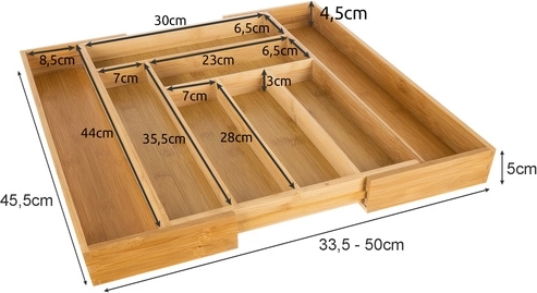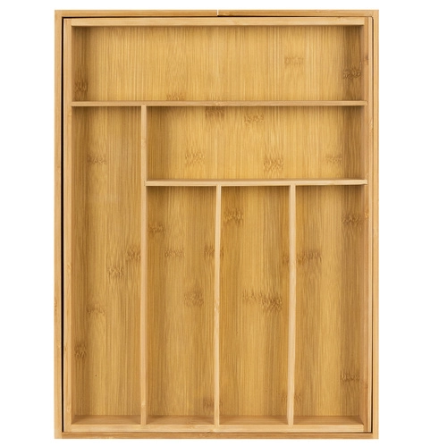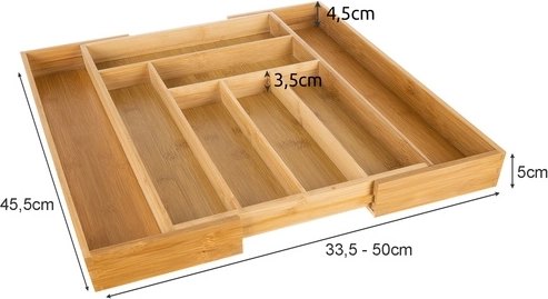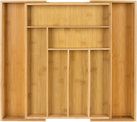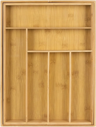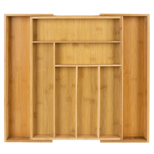 A praktikus, bambuszfából készült betétes rendező a kihúzható oldalfalaknak köszönhetően alkalmazkodik a fiók szélességéhez. Alaphelyzetben 6 rekeszt kínál, széthúzva pedig akár 8 rekeszt a konyhai eszközök és evőeszközök áttekinthető rendszerezéséhez. A sima elválasztók megkönnyítik a rendszerezést és a gyors hozzáférést.