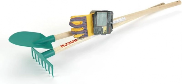 BOSCH gyerek kerti szerszámkészlet: 89 cm-es ásó, 75 cm-es gereblye és kesztyű. Fa nyelek, realista dizájn, 3 éves kortól ajánlott.