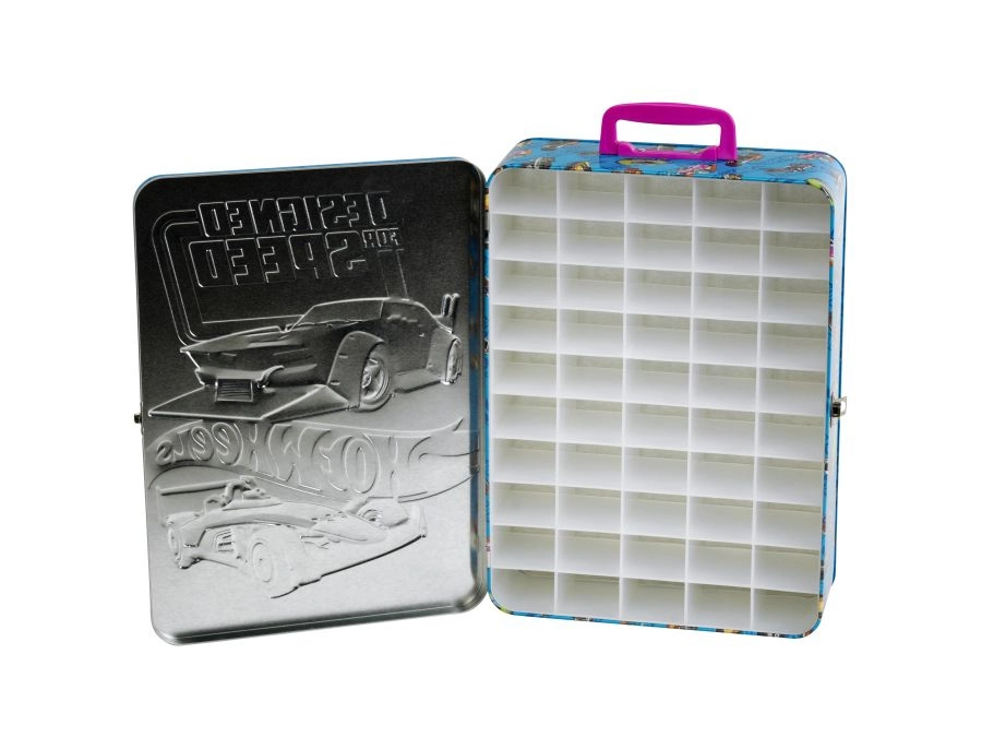 A színes nyomattal és HOT WHEELS logóval ellátott tartós fém ház, a kényelmes narancssárga fogantyú és a véletlen kinyílás ellen védő megbízható fém kapocs ideális tárolási megoldássá teszik ezt a bőröndöt otthonra és utazáshoz is.
