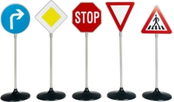 Az öt leggyakrabban használt tábla készlete (pl. STOP, Elsőbbségadás kötelező, Főútvonal, Kötelező haladási irány, Gyalogátkelőhely) segít a gyerekeknek gyorsan elsajátítani az alapvető szabályokat.
