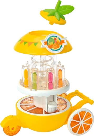Ez a bájos citrusstand gazdag fantáziavilágot nyit a gyerekeknek – a narancsok préselésétől a poharak töltésén át az italok díszítéséig. A fedél felnyitása után öntsd a narancsokat az átlátszó spirálba, engedd le a hátoldali kioldóval, és figyeld, ahogy a forgó helyek megtelnek dzsússzal. Elég a poharat a helyére nyomni, és az ital simán belefolyik.