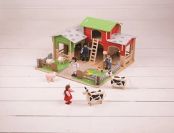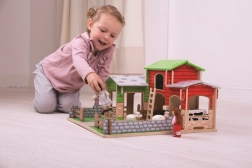 A készlet felelős forrásból származó minőségi fából készült, és kompatibilis más kiegészítőkkel, amelyek bármikor külön megvásárolhatók. A valósághű elemek, mint a kacsatós, a traktorgarázs és a mozgatható kapukkal ellátott karámok támogatják a képzeletbeli játékot, a történetmesélést és a finommotorika fejlődését.