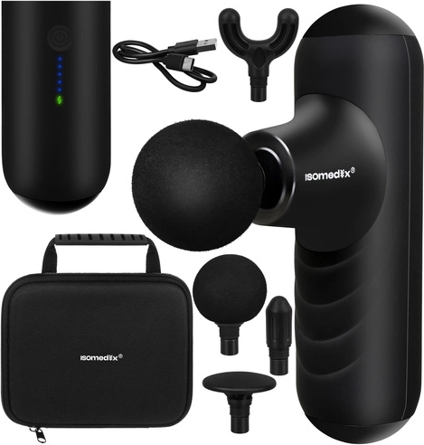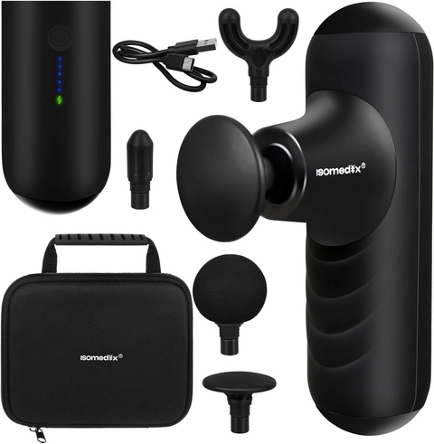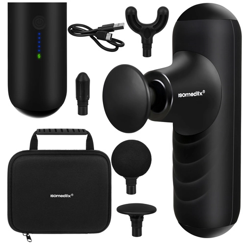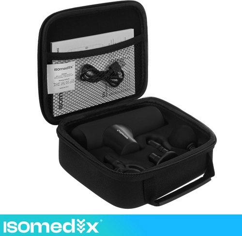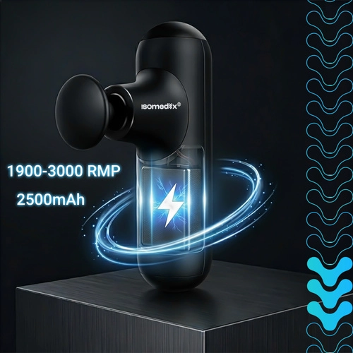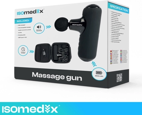 A kompakt ISOMEDIX masszázspisztoly enyhíti az izomfeszültséget és felgyorsítja a regenerációt edzés után és a nap folyamán. Kínál 5 masszázs üzemmódot, 4 cserélhető fejet a célzott terápiához, csendes működést 45 dB alatt és hosszú üzemidőt a 2×2500 mAh akkumulátornak köszönhetően. A könnyű kialakítás kefe nélküli motorral és USB‑C töltéssel ideális otthonra, edzőterembe és utazáshoz is.