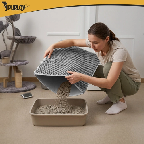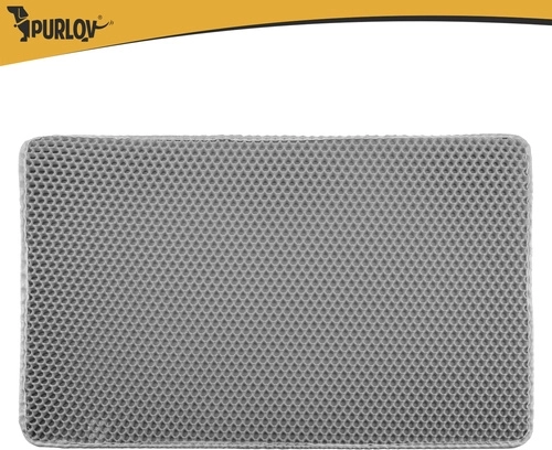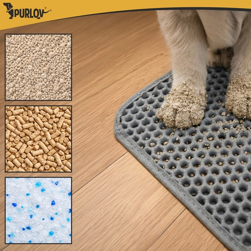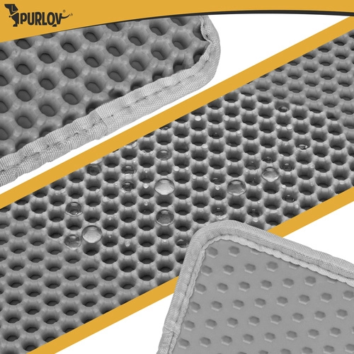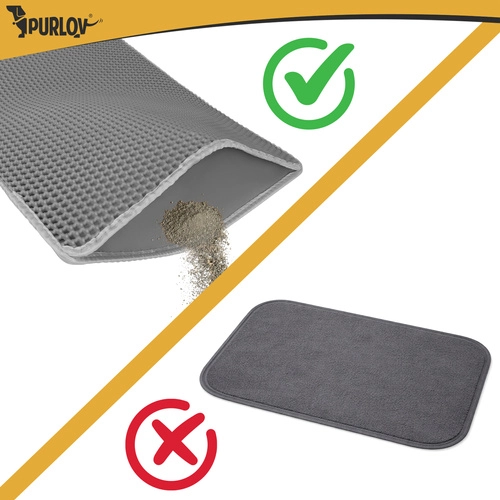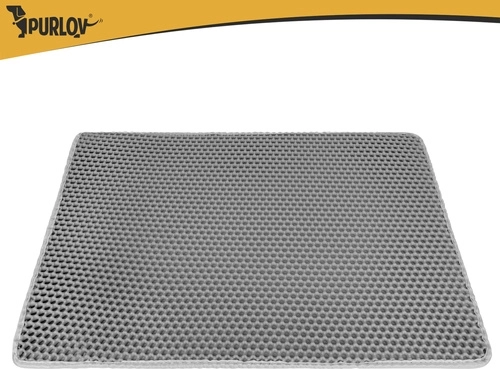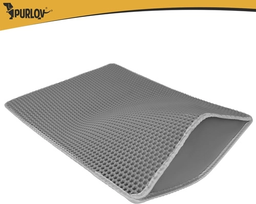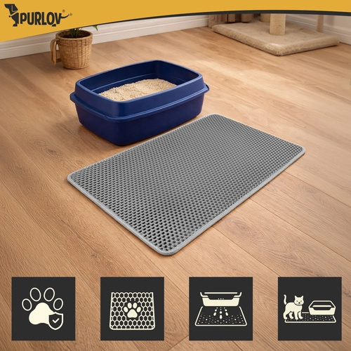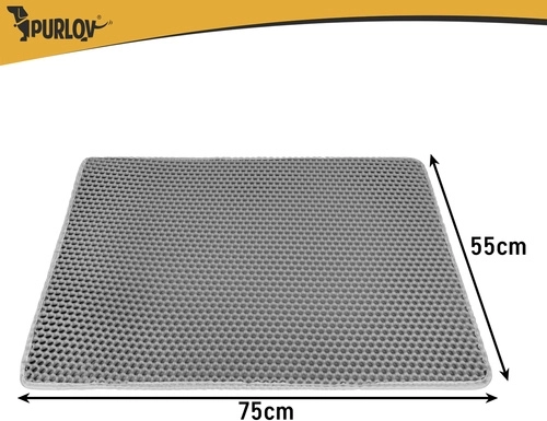 Vége a szétszórt alomnak a lakásban. A Purlov két rétegű alátét 75 × 55 cm méhsejt (honeycomb) felülettel felfogja a szemcséket a mancsokról, nyitható zsebe a könnyű kiöntést szolgálja, vízálló, és a csúszásgátló alsó oldalnak köszönhetően stabilan a helyén marad.