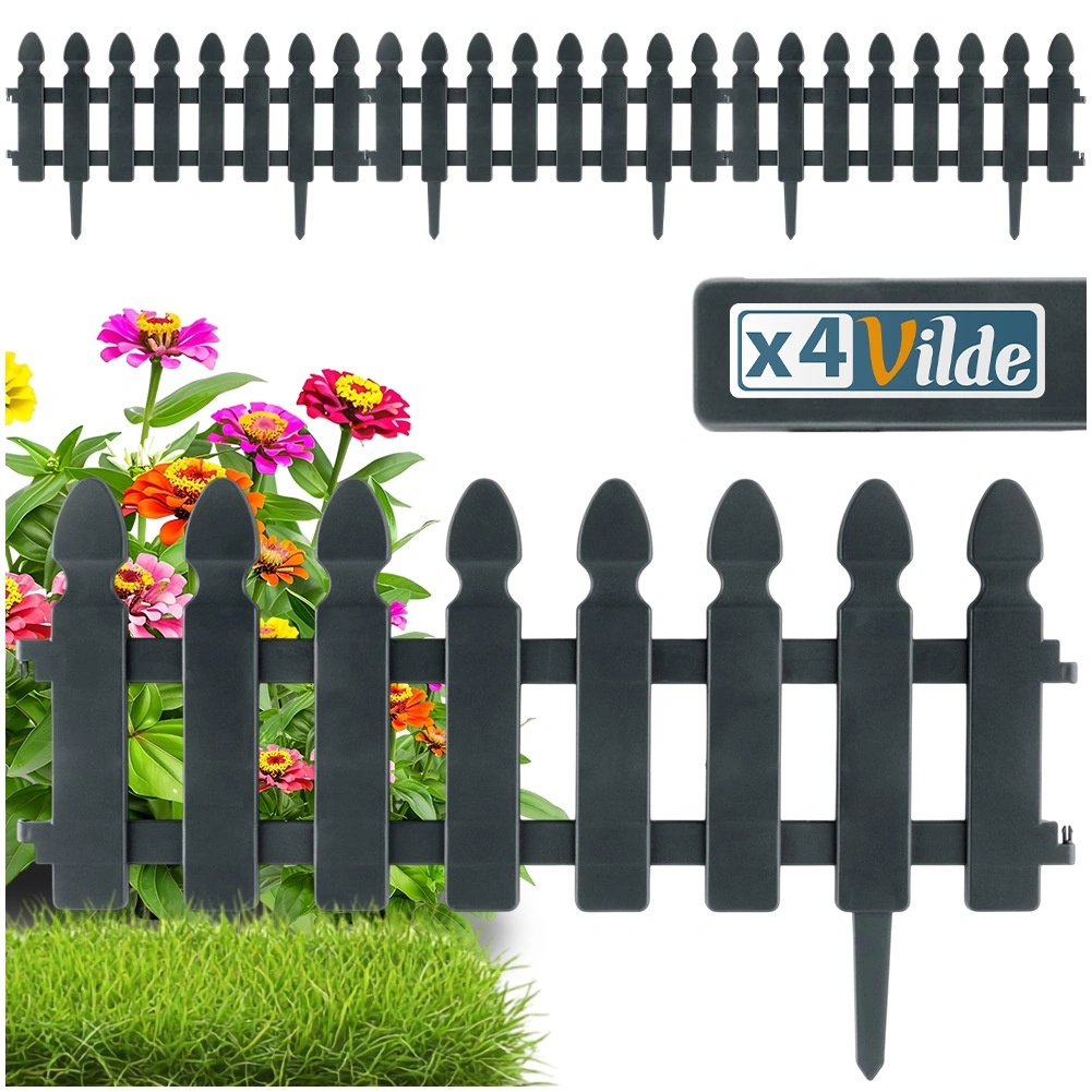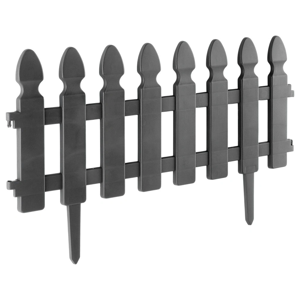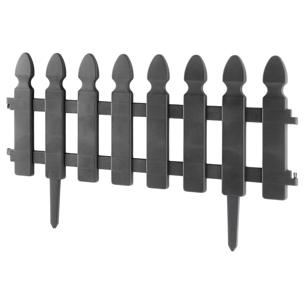 Praktikus, négy darab szürke kerti kerítésből álló készlet a gyep, ágyások és ösvények tiszta elválasztásához. Minden elem mérete 49 × 21 cm, a 7,5 cm hosszú tüskék stabil rögzítést biztosítanak. Az ellenálló műanyag kivitel fagy-, UV- és esőálló. Az elemek könnyen összekapcsolhatók egyenes vagy íves formában – a készlet teljes hossza kb. 195 cm.