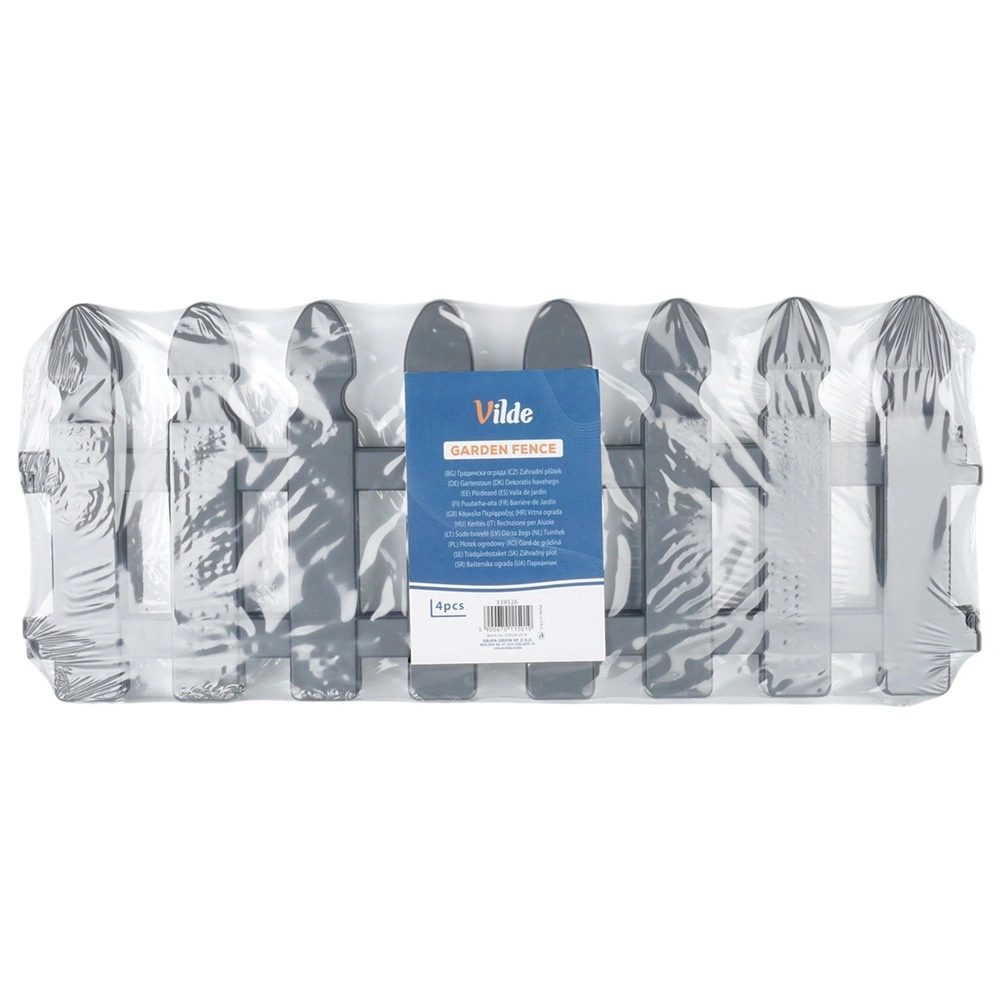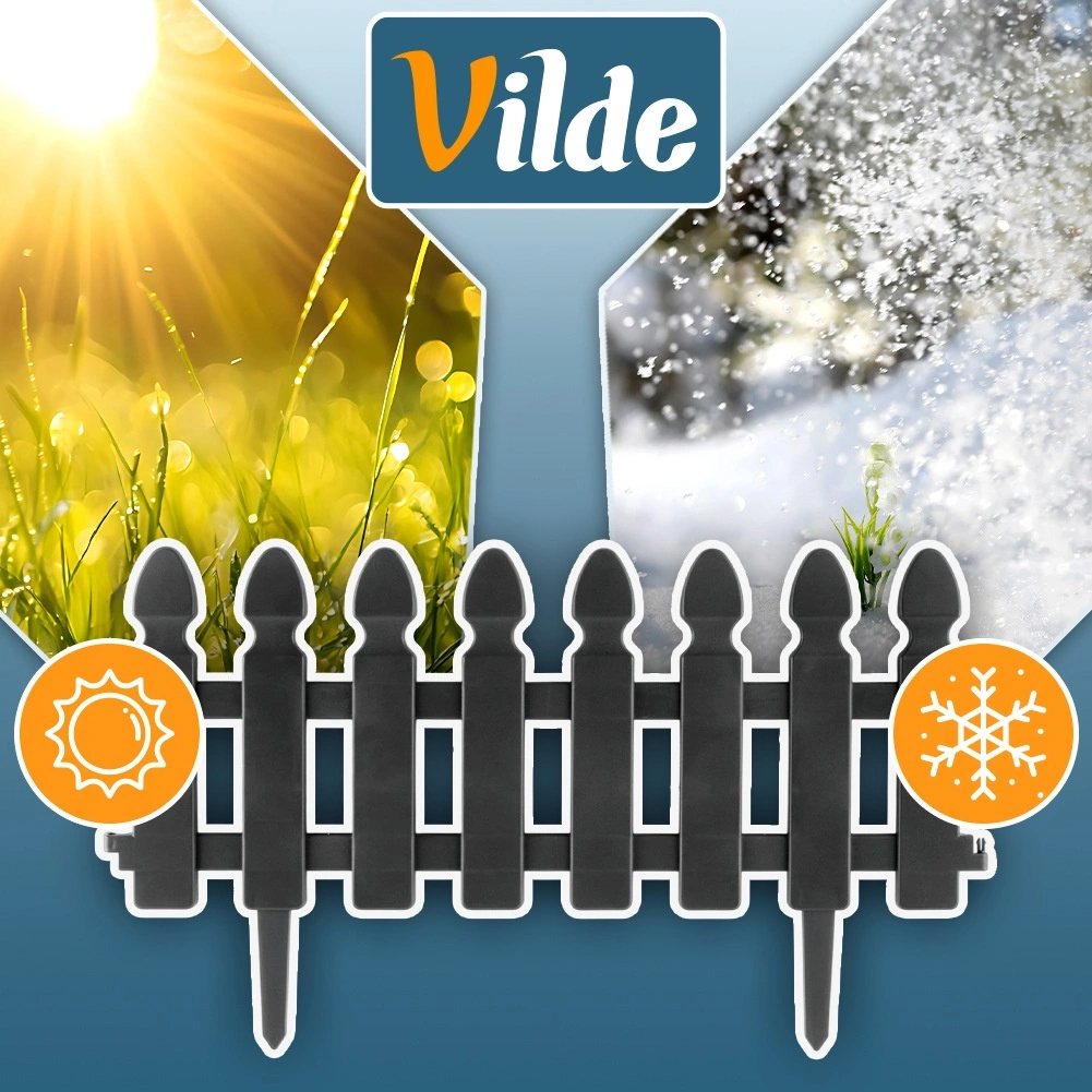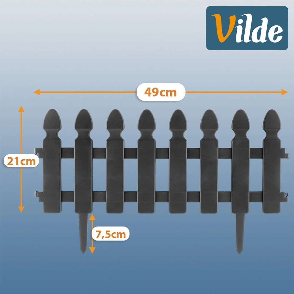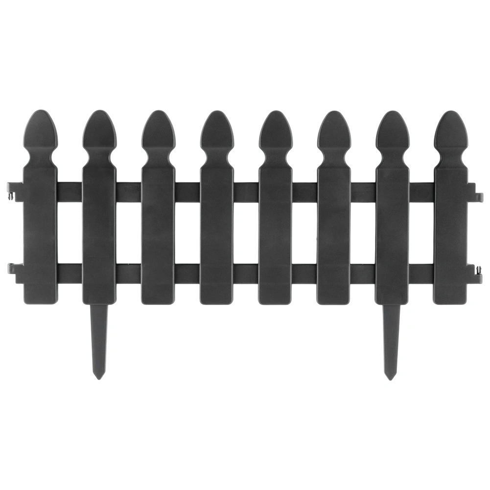 Praktikus, négy darab szürke kerti kerítésből álló készlet a gyep, ágyások és ösvények tiszta elválasztásához. Minden elem mérete 49 × 21 cm, a 7,5 cm hosszú tüskék stabil rögzítést biztosítanak. Az ellenálló műanyag kivitel fagy-, UV- és esőálló. Az elemek könnyen összekapcsolhatók egyenes vagy íves formában – a készlet teljes hossza kb. 195 cm.