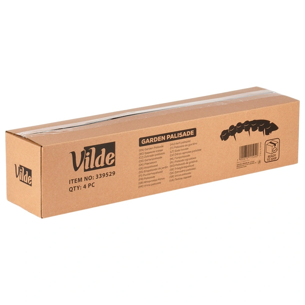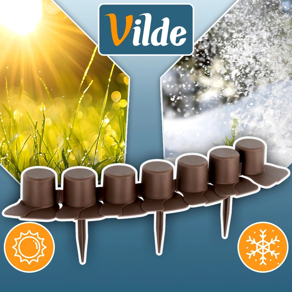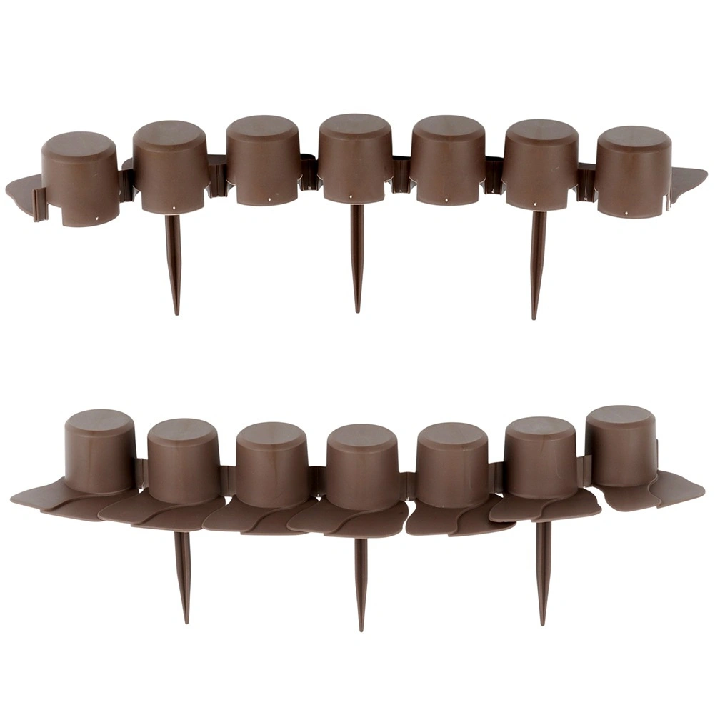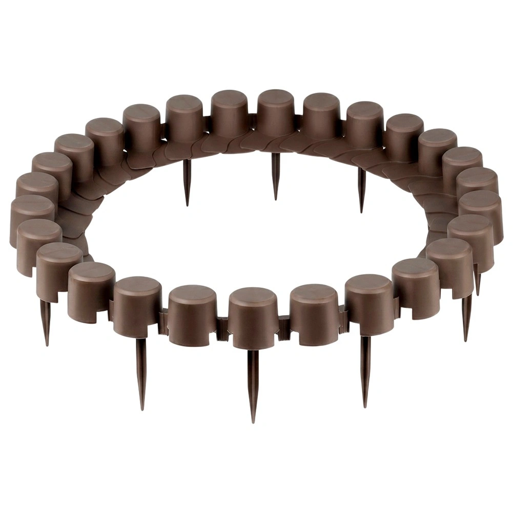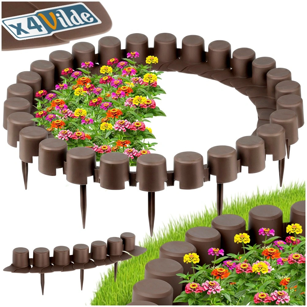 Praktikus és dekoratív barna kerti paliszád, amely tiszta elválasztást biztosít a gyep, az ágyások és az ösvények között. A készlet 4 összekapcsolható szegmenst tartalmaz, összesen 220 cm hosszban, integrált tüskékkel a gyors telepítéshez és fűnyíró-rámpával a szélek könnyű karbantartásához. A tartós műanyag fagy-, UV- és esőálló, hosszú távon megőrzi alakját és színét.