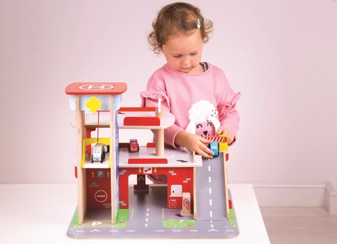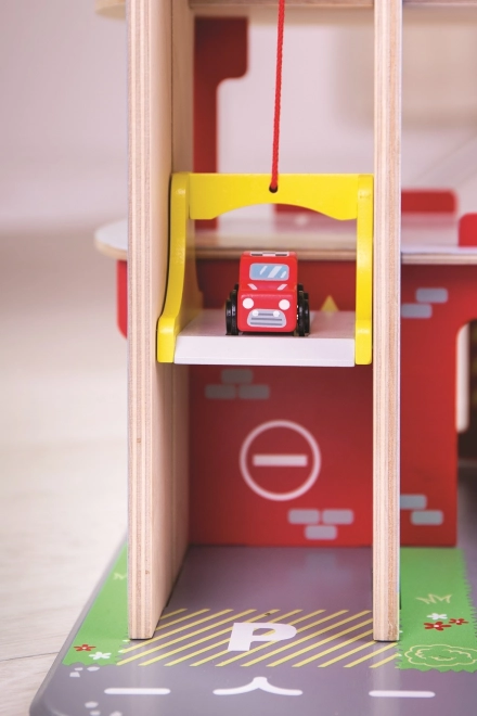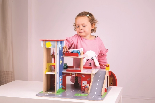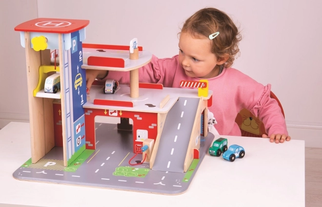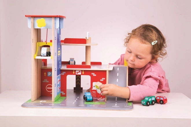 A gyerekek rengeteg szórakozást találnak a háromszintes garázs minden emeletén, parkolóval. A földszinten az autó felhajthat a működő felvonóra, majd felmehet egészen a második emeletre és leparkolhat. A földszinten szerviz, autómosó és benzinkút található. Az első emeletről az autók a felvonóval vagy a rámpán távozhatnak, de vigyázat, meg kell várni, amíg a sorompó felemelkedik! A garázs legmagasabb pontja a heliport. Ez a garázs mindent tud, amire egy kis sofőrnek szüksége van, hogy eljusson A pontból B pontba. Támogatja a kreativitást és a képzelőerőt. Fejleszti a szem-kéz koordinációt, a finommotorikát és az ügyességet. Kiegészíthető Bigjigs Toys és Bigjigs Rail kisautókkal. Felelős forrásból származó, minőségi anyagokból készült. Főbb jellemzők: 3 szint parkolóval és heliporttal, működő felvonó, szerviz, autómosó és benzinkút a földszinten.